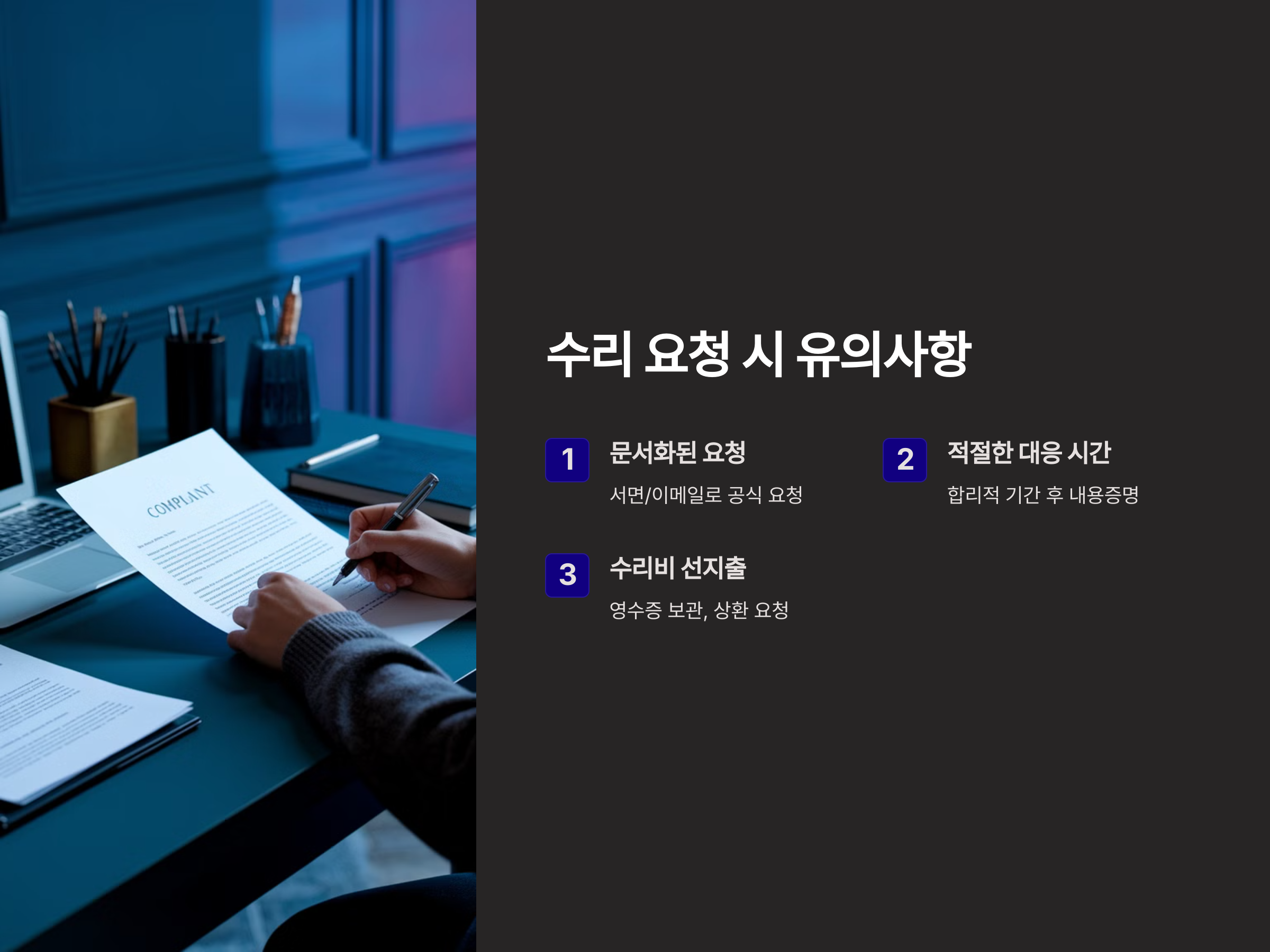 - 적절한 대응 시간 부여: 집주인에게 수리 요청을 한 후, 합리적인 기간 내에 수리가 이루어지지 않는다면, 내용증명을 통해 다시 한 번 공식적으로 요청할 수 있습니다.
