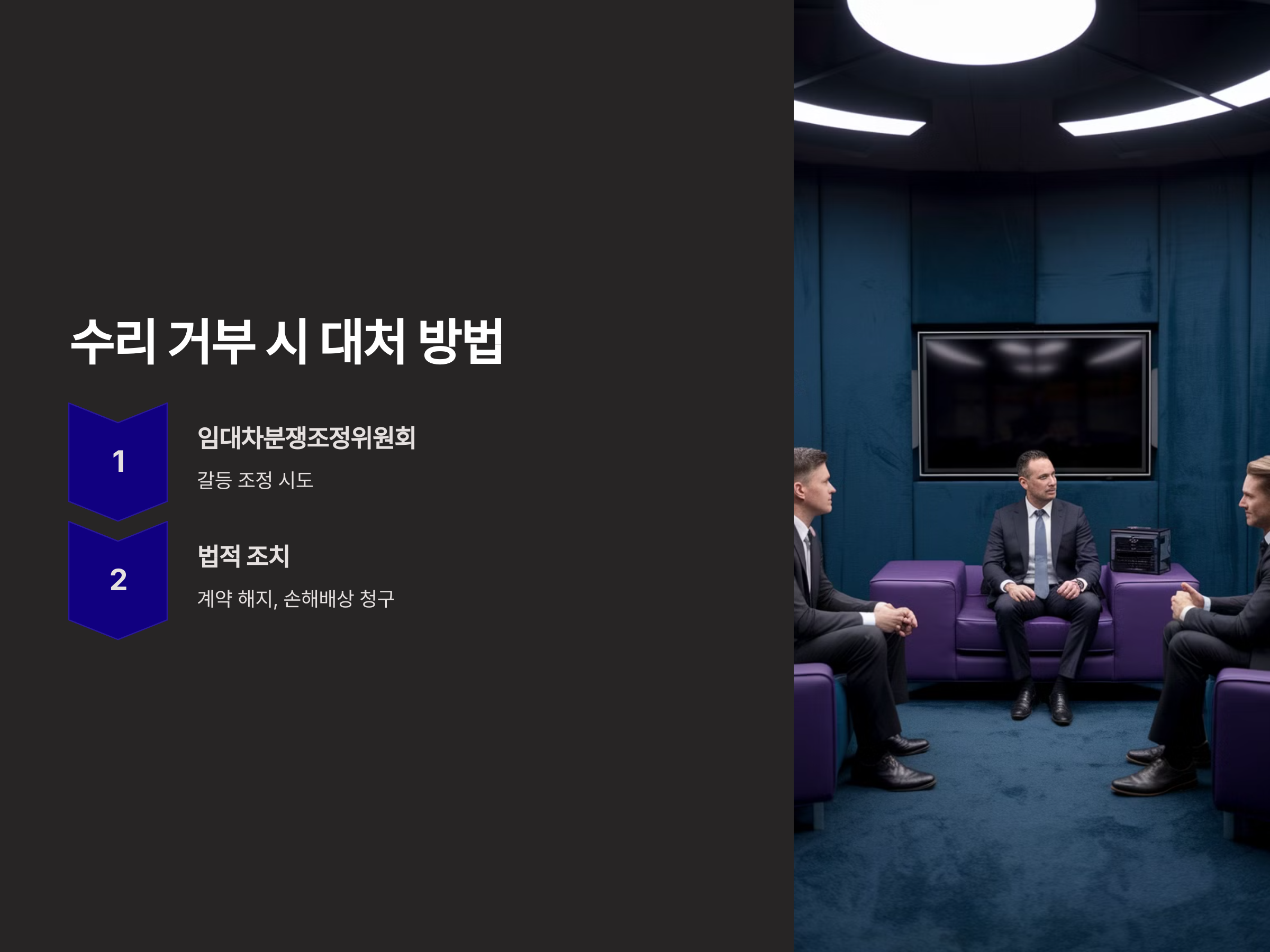 - 법적 조치 고려: 집주인의 지속적인 수리 거부로 인해 거주에 심각한 불편이 발생한다면, 임대차 계약 해지 및 손해배상 청구 등의 법적 조치를 고려할 수 있습니다.