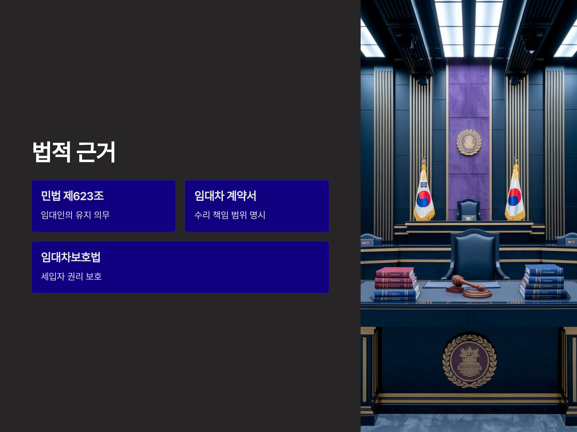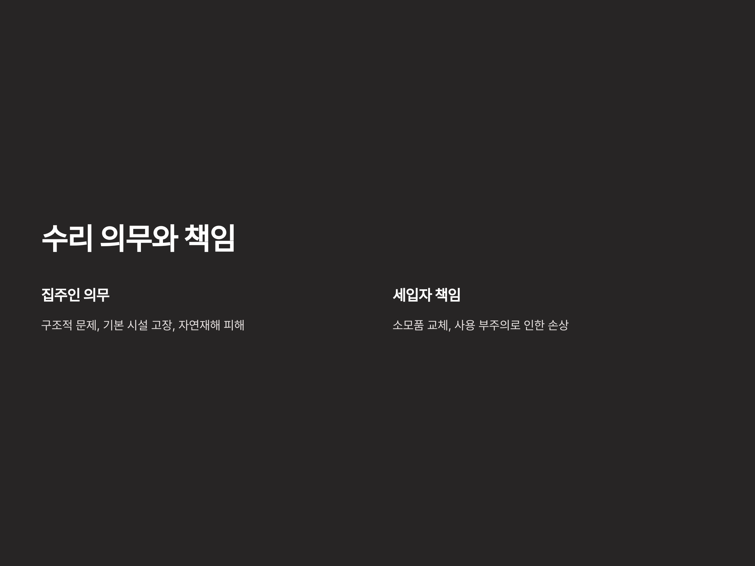 - 계약서에 수리 책임 명시: 임대차 계약서에 수리와 관련된 책임 범위를 명확히 기재하여 추후 분쟁을 예방합니다.