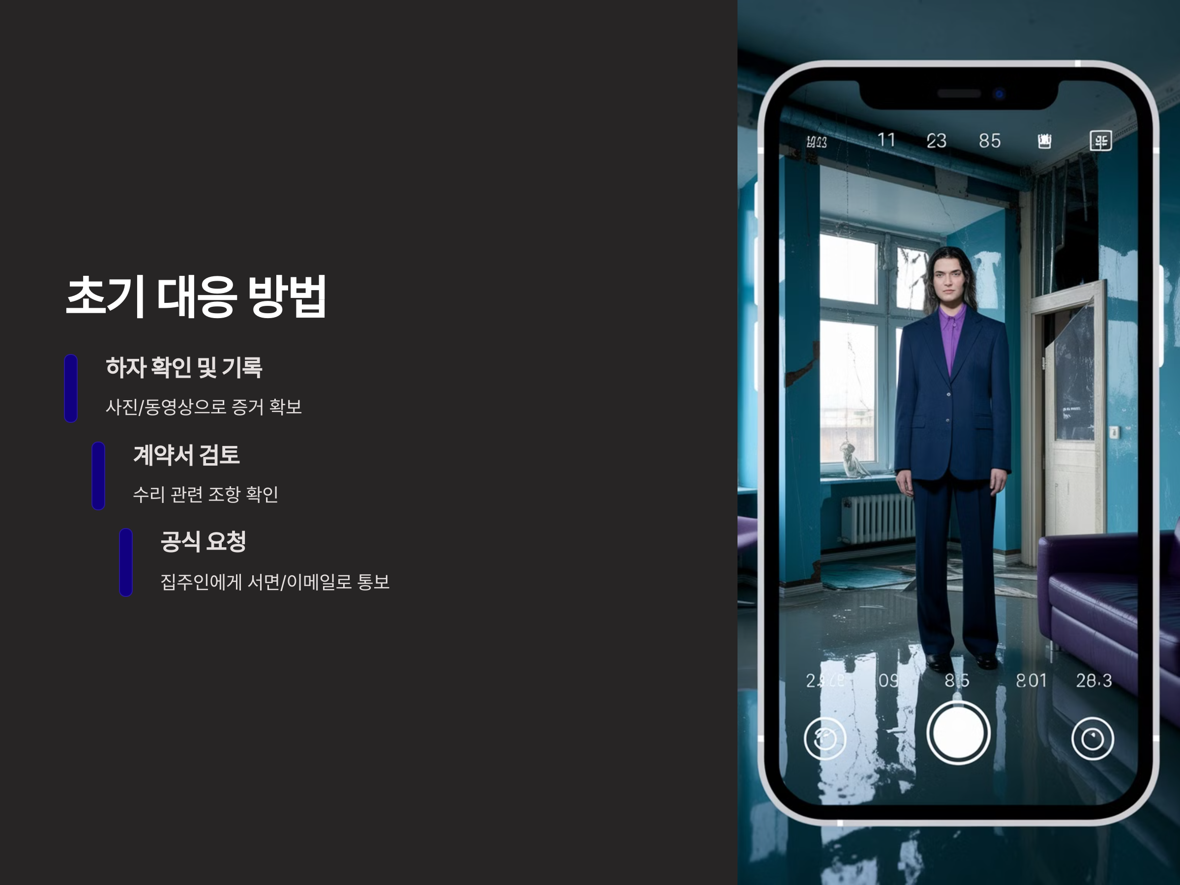 - 집주인에게 공식 요청: 하자를 발견한 즉시 집주인에게 전화나 문자로 알리고, 서면이나 이메일로 공식적인 수리 요청을 합니다. 이때 하자의 상세 내용과 기록한 사진 또는 동영상을 함께 전달하면 도움이 됩니다.