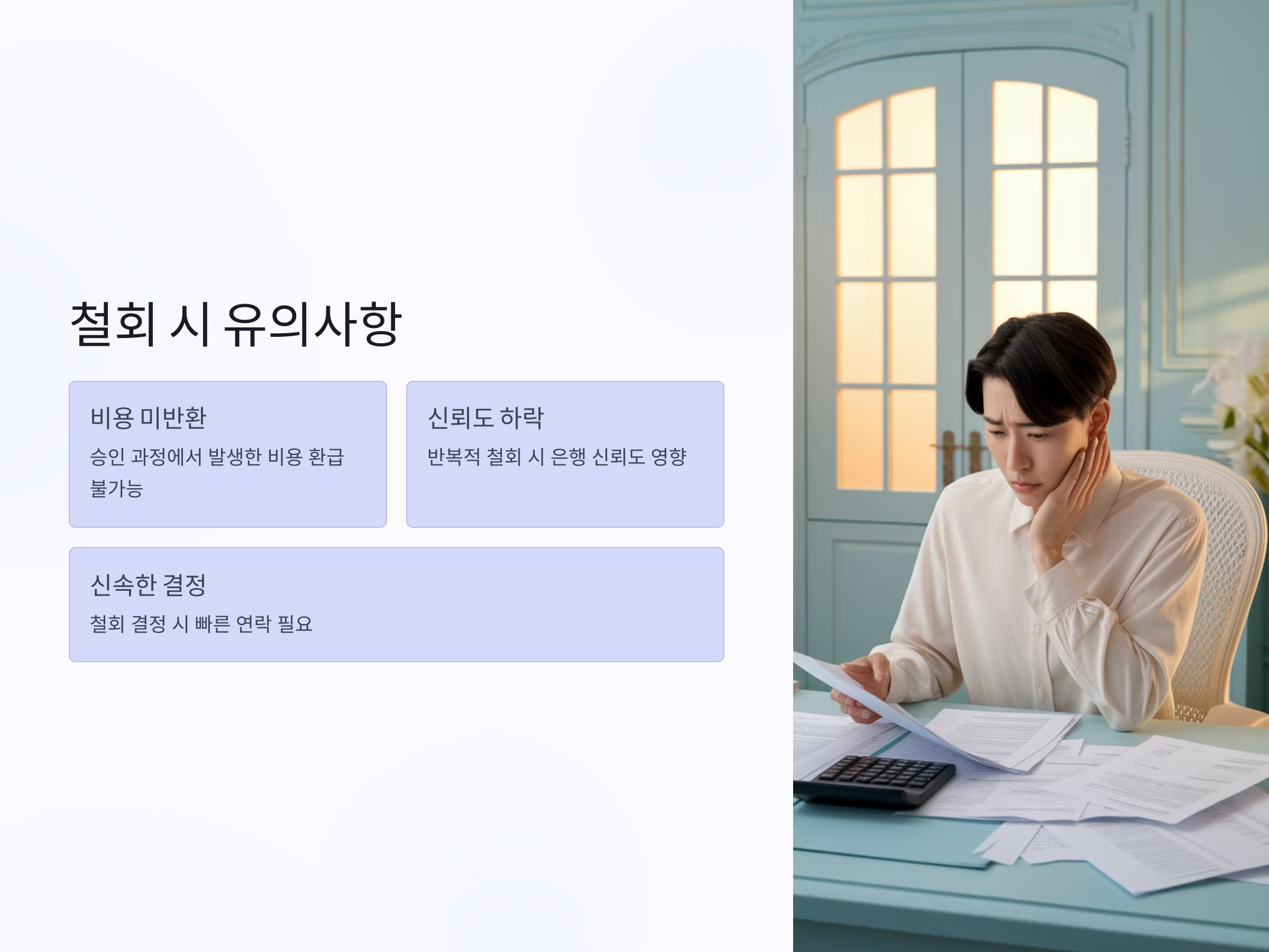 전세 대출 승인 후 철회 시 몇 가지 유의할 점이 있습니다. 우선, 대출을 철회한다고 하더라도 대출 신청 시 발생한 비용은 반환되지 않을 수 있습니다. 예를 들어, 대출 승인을 위한 서류 제출이나 심사 과정에서 발생한 비용은 대출을 철회한다고 해도 환급되지 않는 경우가 많습니다.