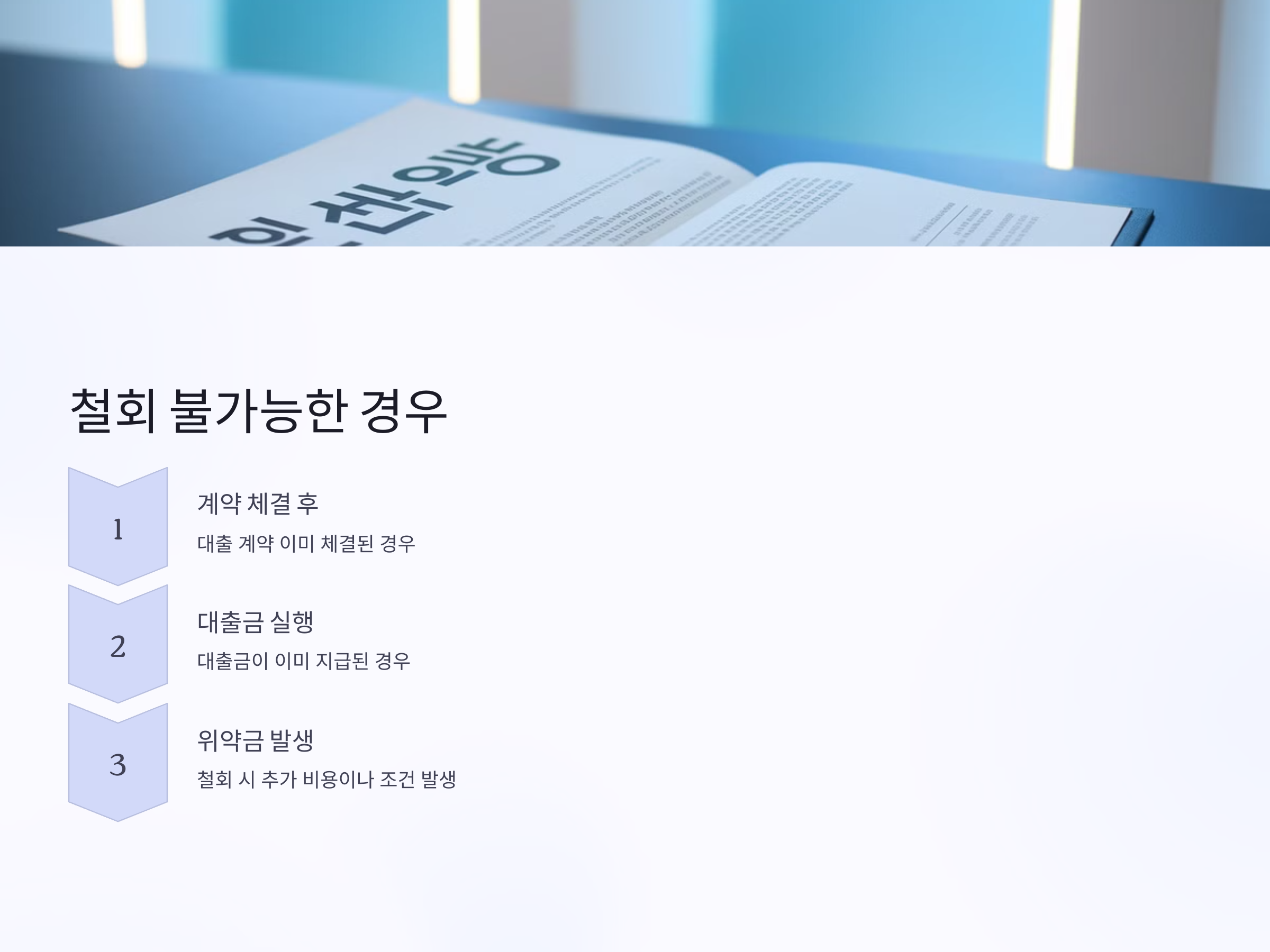 대출 승인 후 철회가 불가능한 경우도 있습니다. 예를 들어, 이미 대출 계약을 체결한 경우에는 대출 철회가 불가능할 수 있습니다. 대출 계약을 체결한 후에는 대출이 실행되기 때문에, 이 시점에서 대출 철회를 요청하는 것은 거의 불가능합니다.