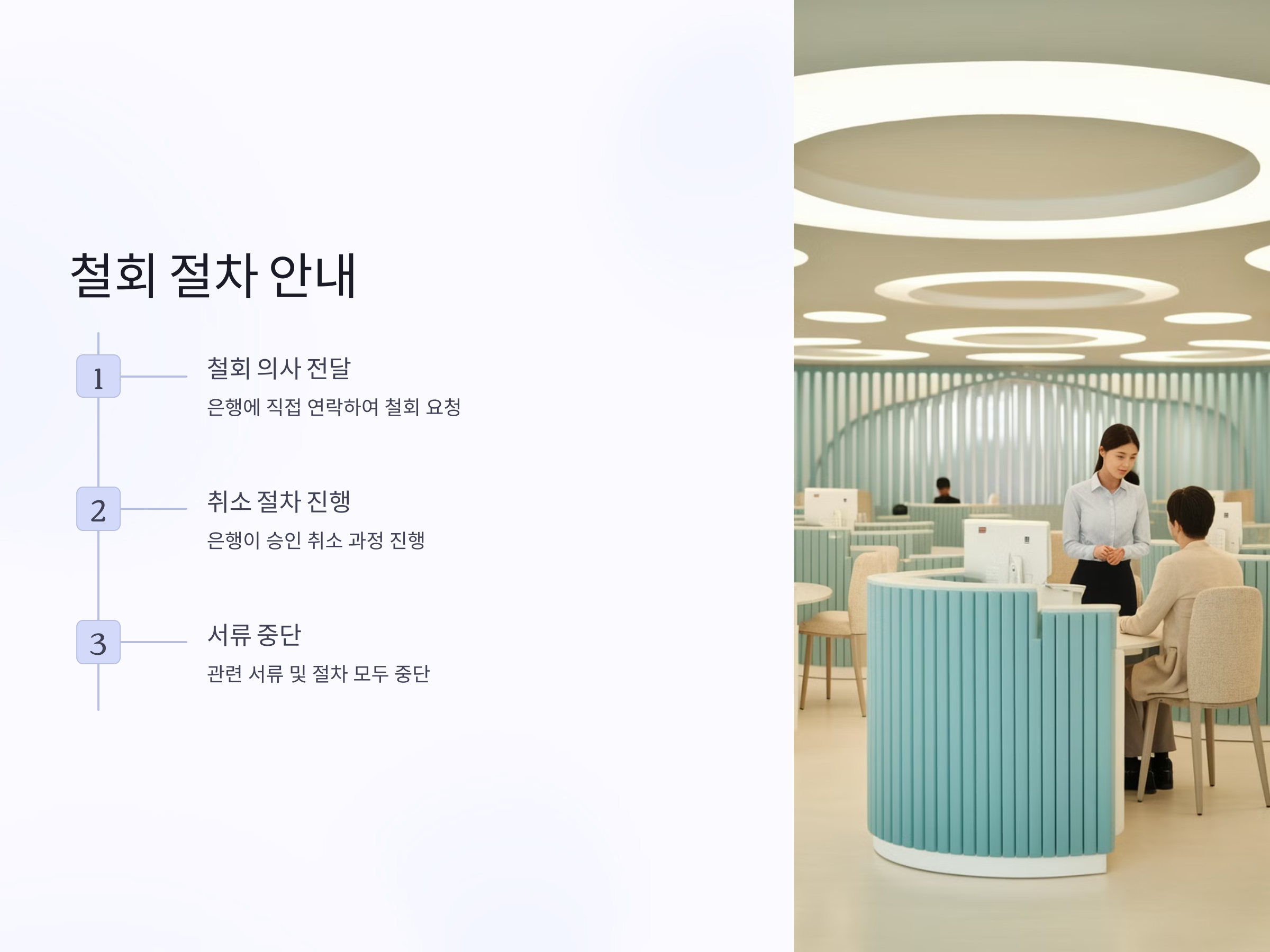 대출 철회 과정에서 필요한 서류나 절차는 은행마다 조금씩 다를 수 있으므로, 해당 은행에 직접 문의하여 정확한 정보를 얻는 것이 중요합니다.