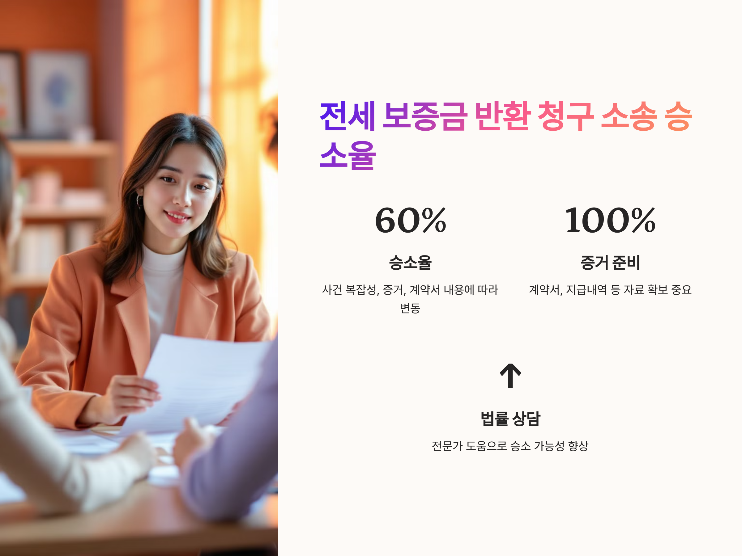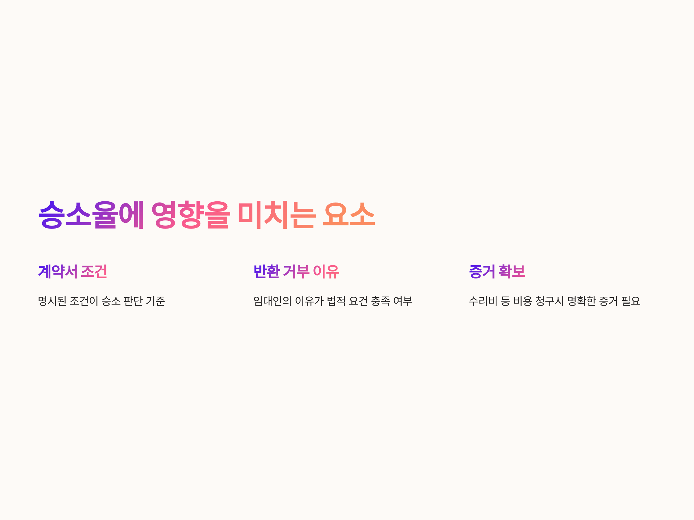 승소율을 높이기 위해서는 법적 절차를 신중하게 밟고, 필요한 증거들을 빠짐없이 준비하는 것이 중요합니다. 예를 들어, 계약서에 명시된 보증금 반환 조건이나 임대인의 지급 내역을 명확히 증명할 수 있는 자료를 확보하는 것이 승소율을 높이는 데 중요한 역할을 합니다.