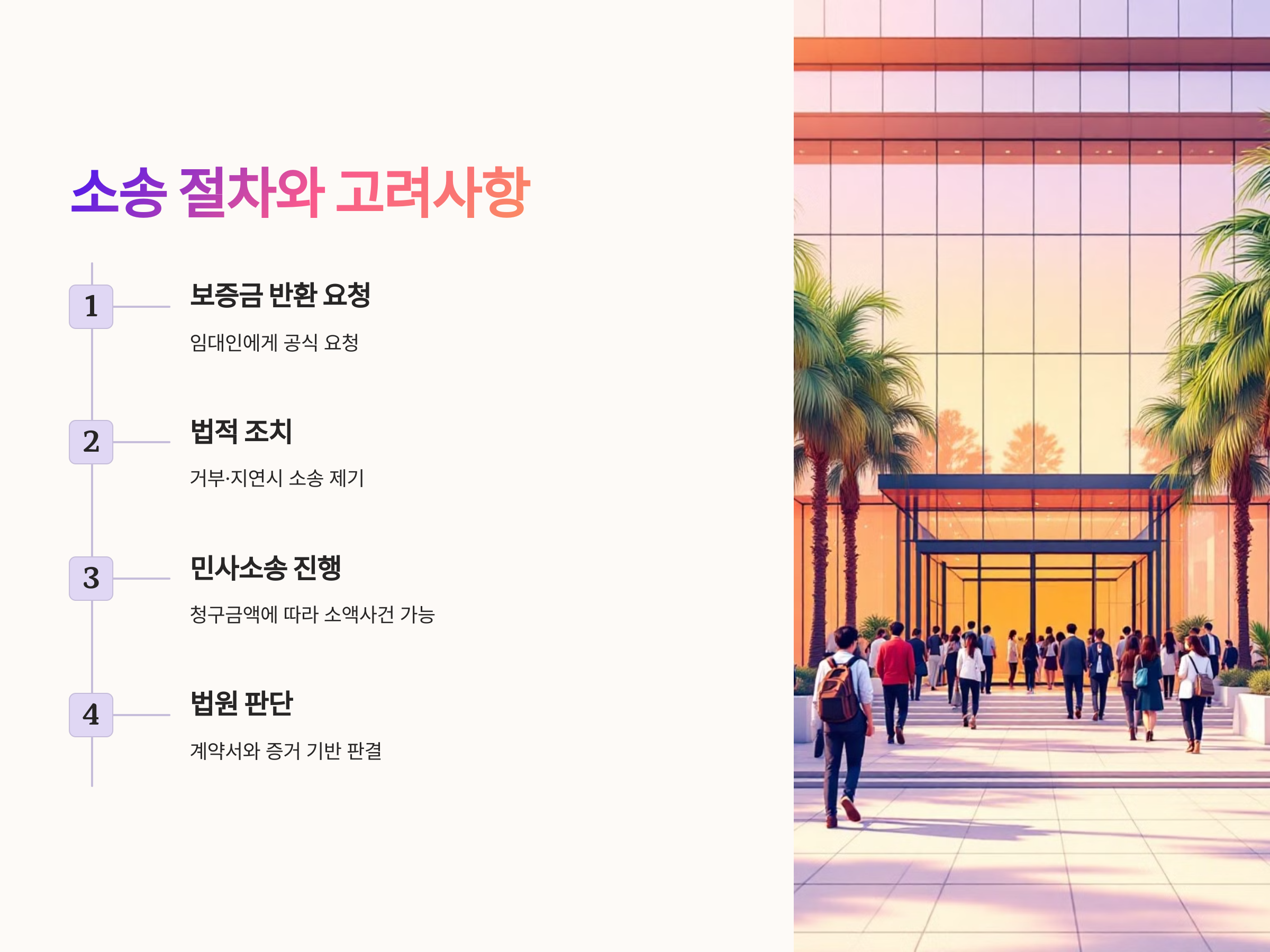 법적 절차는 대개 민사소송의 형태로 진행되며, 청구금액에 따라 소액 사건으로 처리될 수도 있습니다. 법원에서는 계약서와 관련 증거들을 제출하여 임차인의 청구가 합당한지를 판단하게 됩니다. 이를 통해 법원은 보증금을 반환할 의무가 있는지, 그리고 반환 지연이 합당한지 여부를 판별합니다.