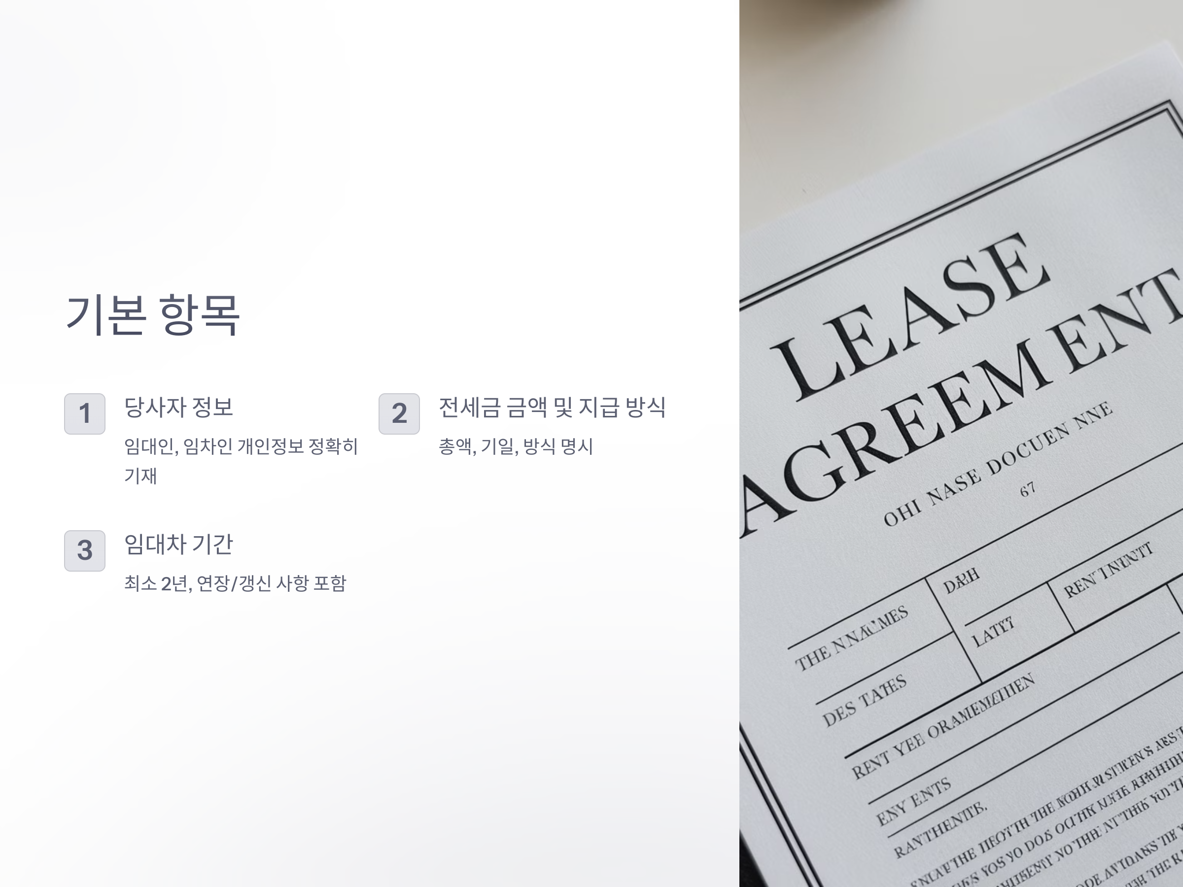 전세 계약서를 작성할 때 가장 기본이 되는 항목은 다음과 같습니다. 이 항목들을 빠짐없이 기재해야 계약 후 문제가 발생했을 때 법적인 보호를 받을 수 있습니다.