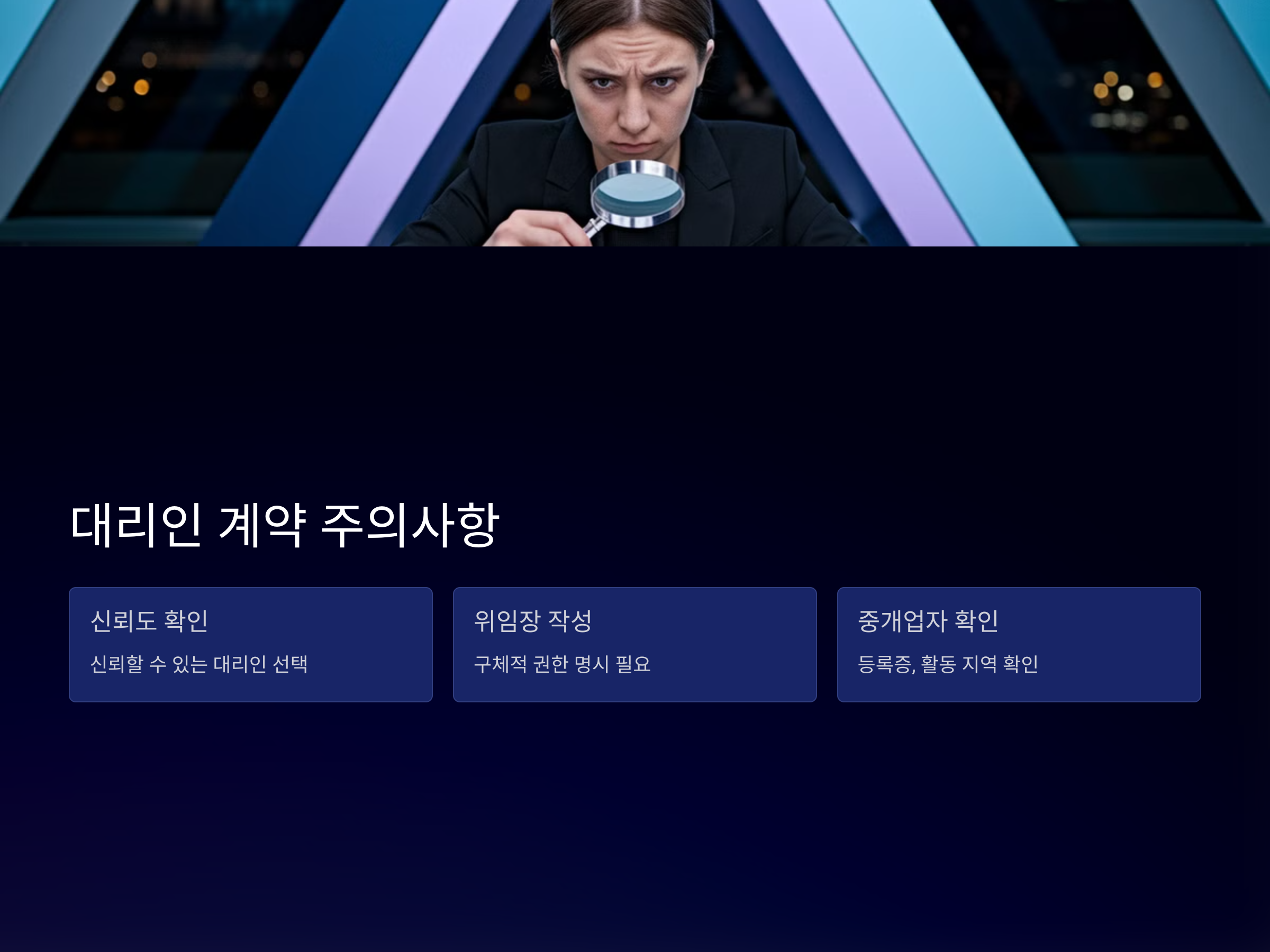 - 대리인의 신뢰도 확인: 대리인을 신뢰할 수 있는 사람으로 선택하는 것이 가장 중요합니다. 계약은 금전적인 요소가 많기 때문에, 대리인의 부주의나 실수로 인해 큰 손해를 볼 수 있습니다.