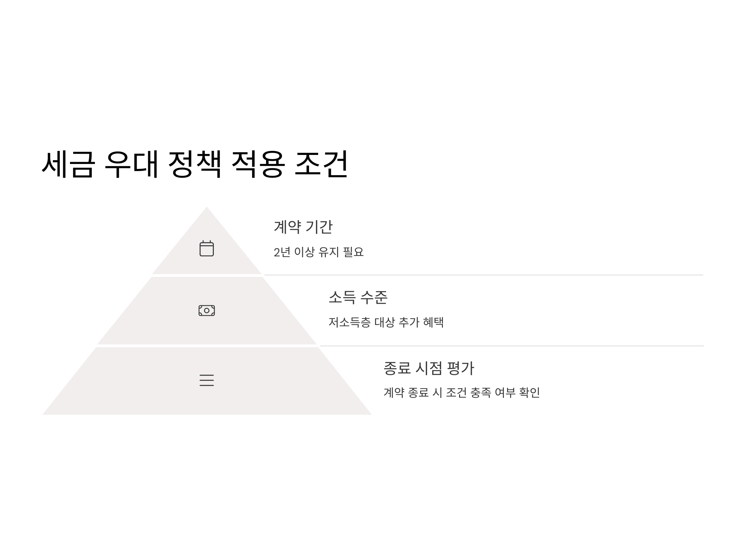 세금 우대 정책은 모든 전세 계약에 적용되지 않습니다. 일반적으로 몇 가지 조건을 충족해야만 혜택을 받을 수 있습니다. 가장 중요한 조건은 "전세 계약 기간"입니다. 예를 들어, 전세 계약을 2년 이상 유지하는 세입자는 일정 부분 세금 우대를 받을 수 있습니다. 또한, 저소득층을 대상으로 하는 세금 혜택도 있으며, 이를 통해 계약자들이 더 큰 혜택을 누릴 수 있습니다.