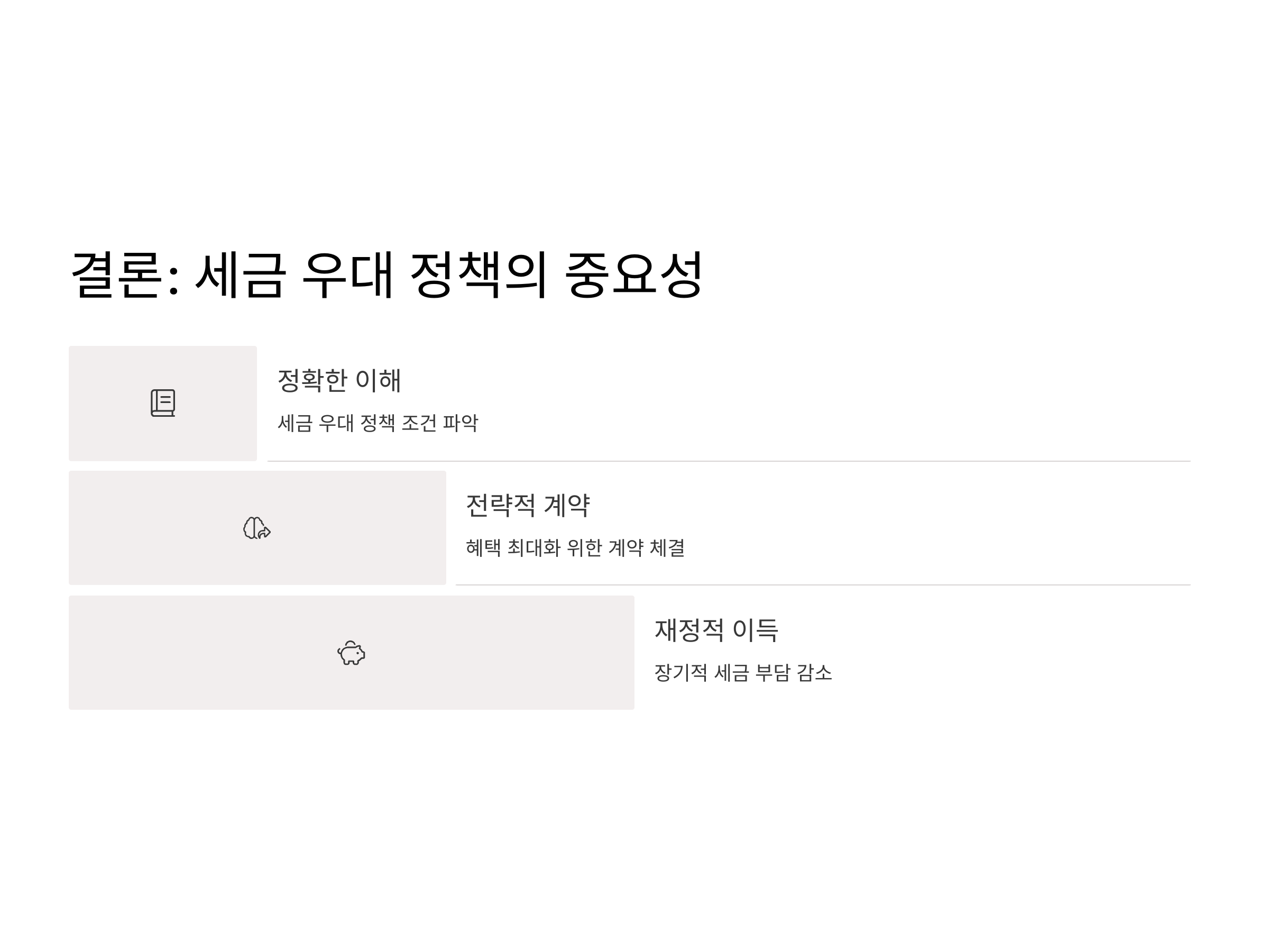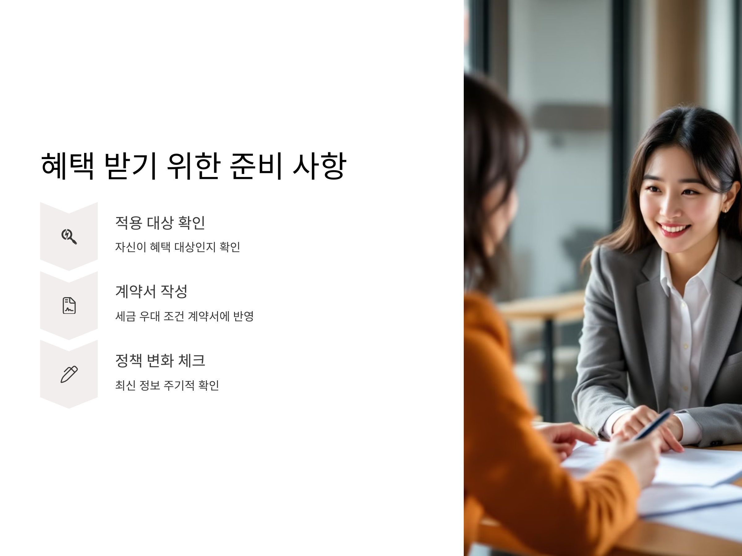 그 외에도, 계약서 작성 시 세금 우대 정책이 반영될 수 있도록 협의하는 것이 필요합니다. 계약자가 세금 혜택을 받을 수 있는 조건을 포함시켜 계약을 체결하면, 이후 혜택을 받을 수 있는 가능성이 높아집니다. 또한, 관련 법률과 정부의 정책 변화를 주기적으로 체크하는 것이 좋습니다.