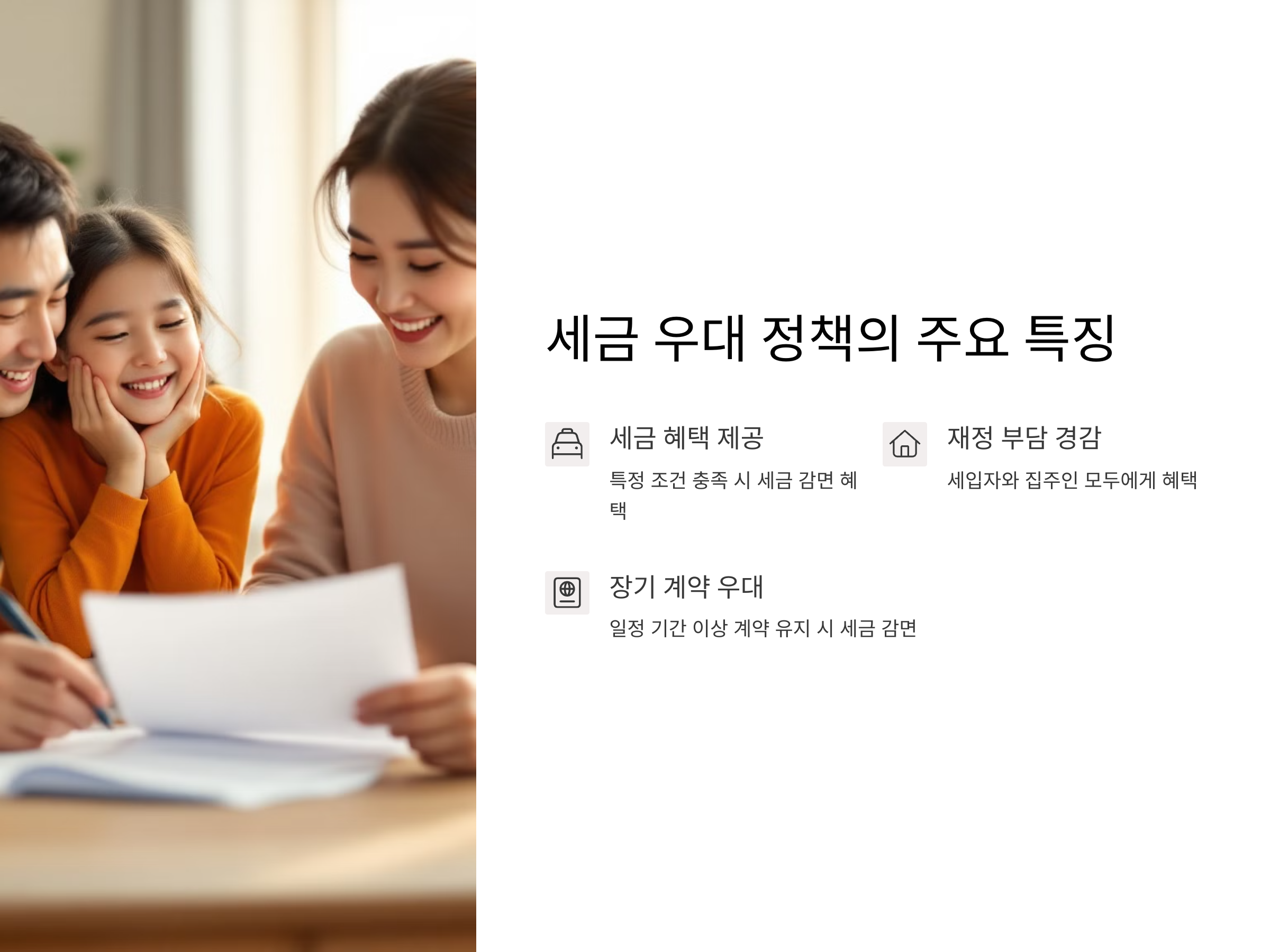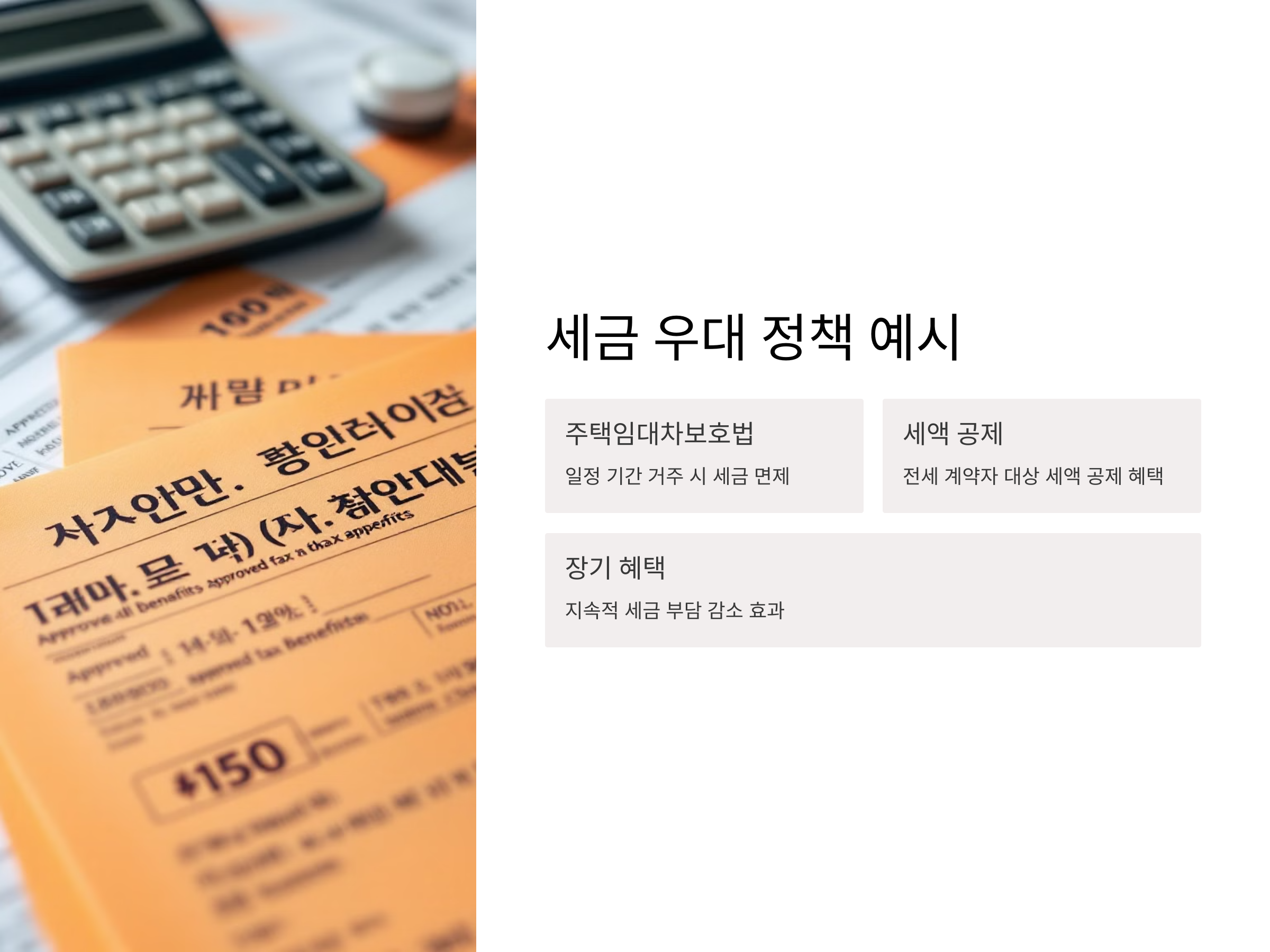 전세 계약에서 세금 우대 정책이란, 특정 조건을 충족하는 세입자나 집주인에게 세금 혜택을 제공하는 제도입니다. 정부는 세입자와 집주인의 재정적 부담을 덜어주기 위해 주택 관련 세금 우대 정책을 도입해왔습니다. 예를 들어, 전세 계약을 일정 기간 이상 유지하는 세입자에게는 일부 세금을 감면하거나 면제해주는 혜택을 부여할 수 있습니다.