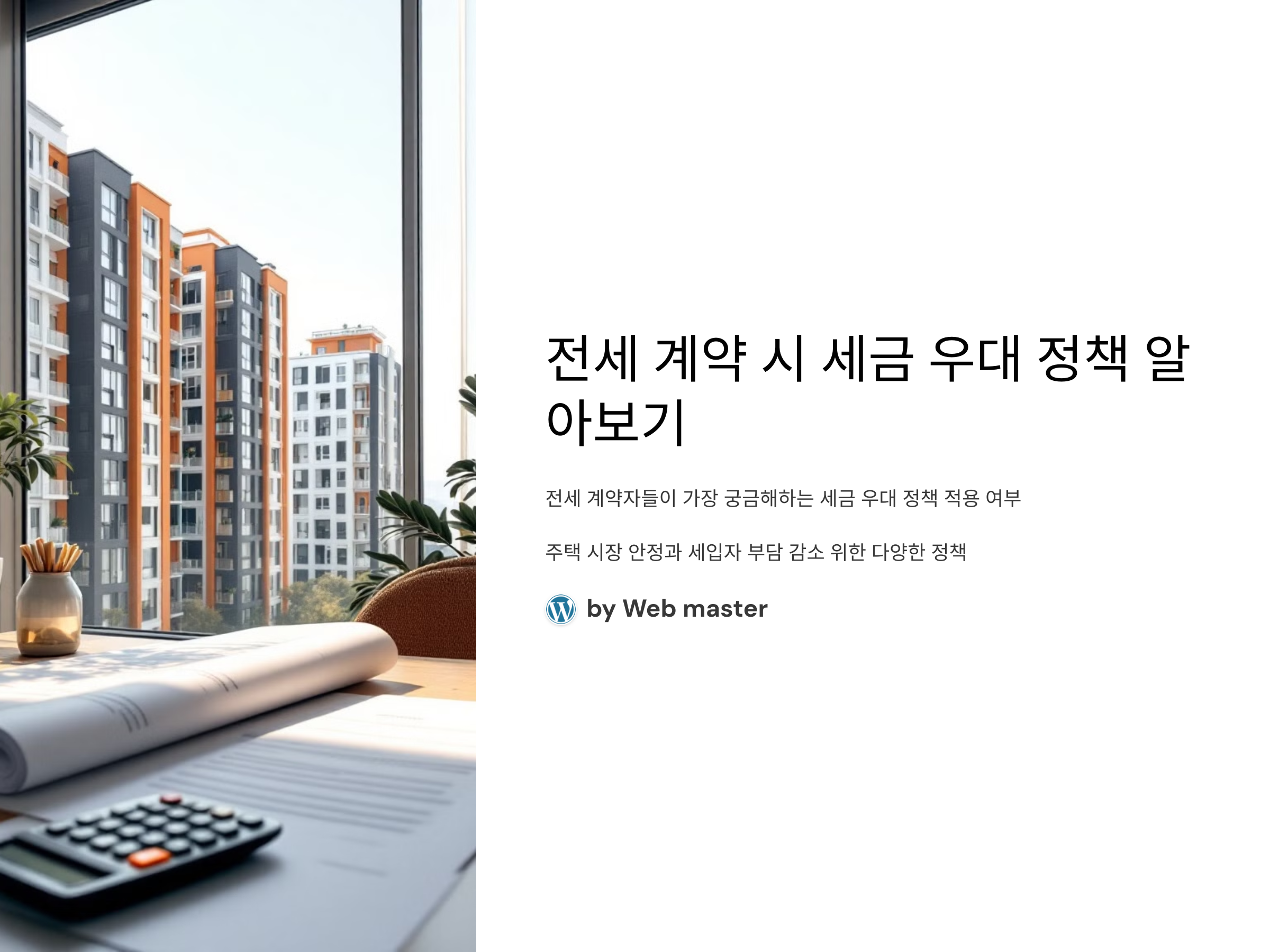 전세 시장에서 계약자들이 가장 궁금해하는 사항 중 하나는 바로 "세금 우대 정책이 적용되는지" 여부입니다. 정부의 세금 우대 정책은 주택 시장 안정과 세입자의 부담을 줄이기 위해 다양한 형태로 시행되고 있습니다. 그럼에도 불구하고 전세 계약을 체결하는 사람들이 반드시 알아야 할 세금 우대 정책의 적용 범위와 조건은 무엇일까요? 이번 글에서는 전세 계약 시 세금 우대 정책이 적용되는지 여부와 함께 주요 사항을 설명해 드립니다.