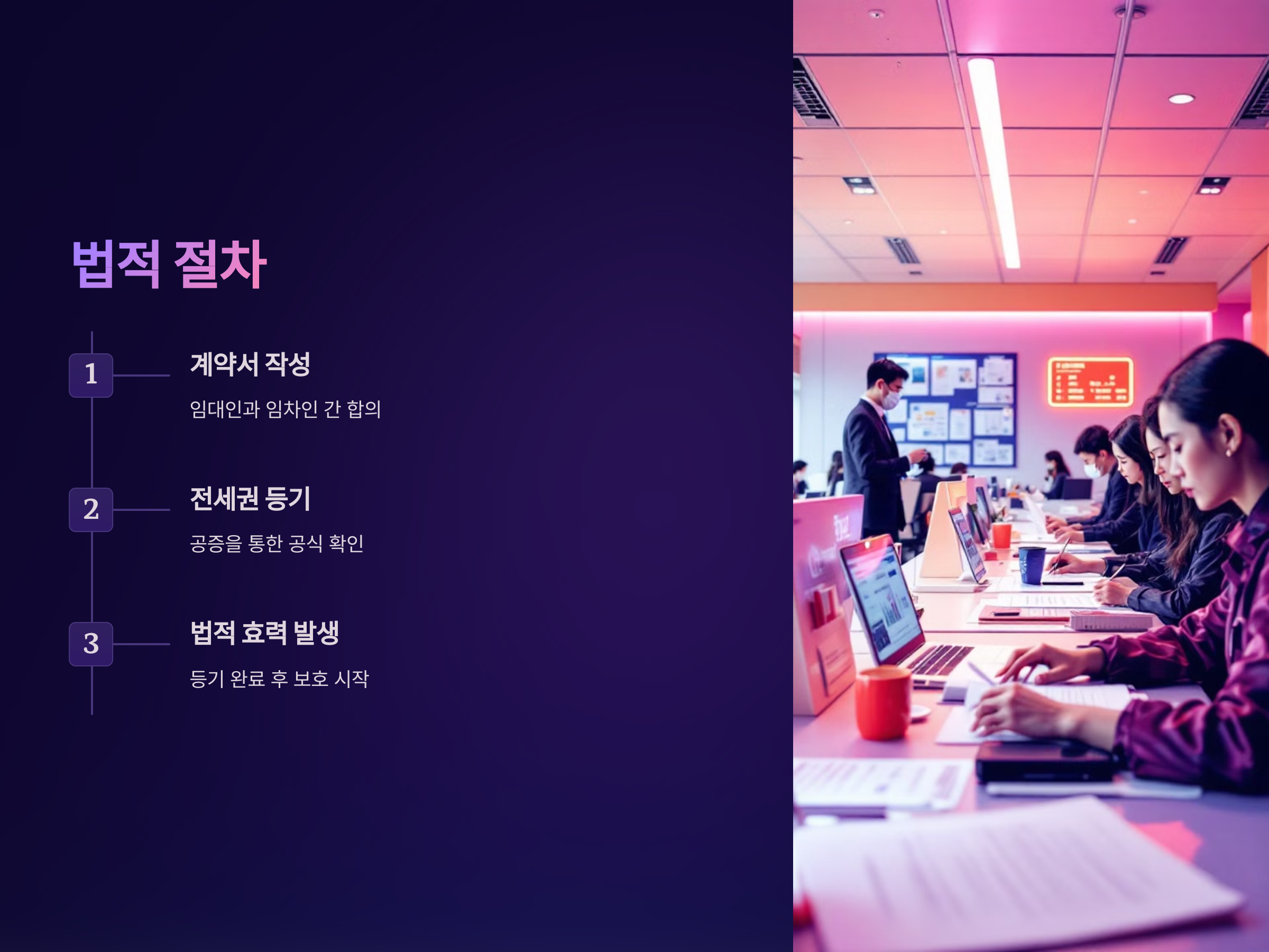 전세권 설정은 법적 절차에 의해 진행됩니다. 이 절차는 계약서 작성, 전세권 등기, 그리고 임차인의 전세금 반환을 위한 법적 절차 등을 포함합니다. 전세권 설정이 완료되면 임차인은 해당 주택에 거주할 수 있는 법적 권리를 갖게 됩니다. 전세권 등기는 공증을 통해 공식적으로 확인되며, 이를 통해 임차인은 분쟁 발생 시 법적 보호를 받을 수 있습니다.