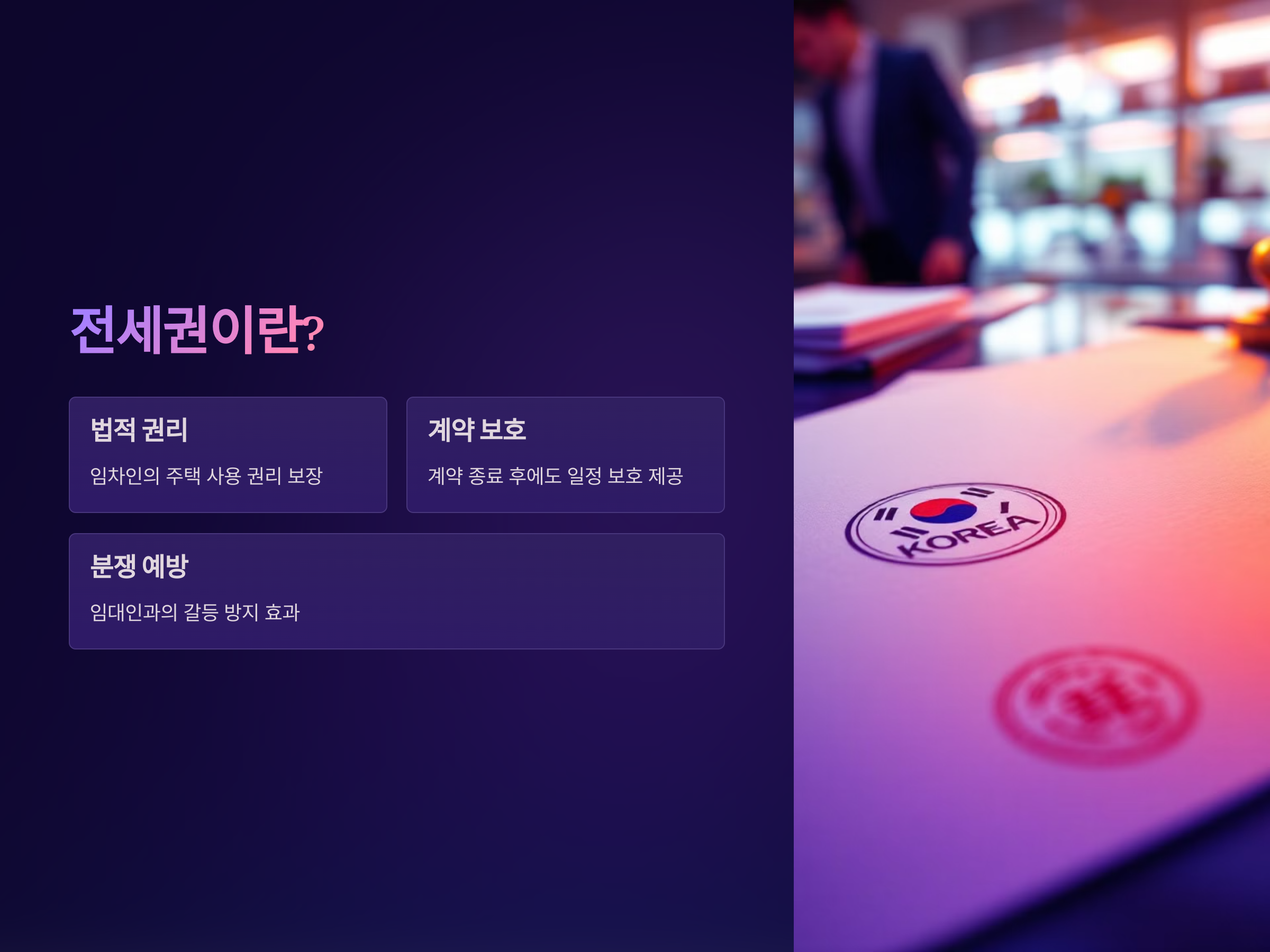 전세권은 일반적으로 계약서에 명시되어 있으며, 이 권리는 계약이 끝난 후에도 일정한 보호를 받을 수 있도록 합니다. 이를 통해 임차인은 전세금을 반환받을 때까지 해당 주택에 거주할 수 있는 안정적인 권리를 가지게 됩니다. 또한, 전세권 설정을 통해 임차인은 임대인과의 분쟁을 피할 수 있는 장점이 있습니다.