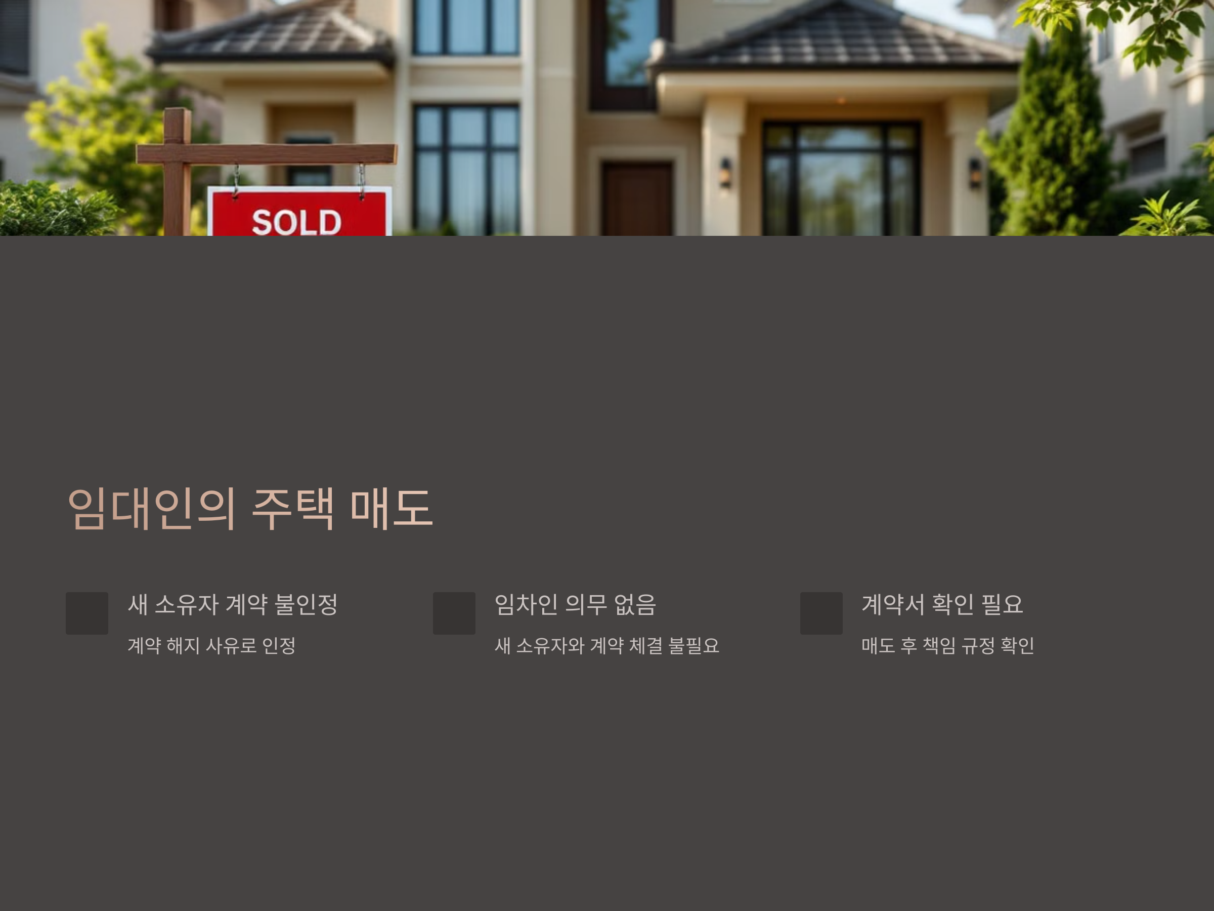 이 경우, 임차인은 매도 후 새로운 주택 소유자와 새로운 계약을 체결할 의무가 없으며, 법원에서 계약 해지 사유를 인정할 가능성이 높습니다. 다만, 계약서에 매도 후의 책임이나 규정이 명시되어 있는지, 그리고 계약 기간이 남아 있는지 여부에 따라 달라질 수 있습니다.