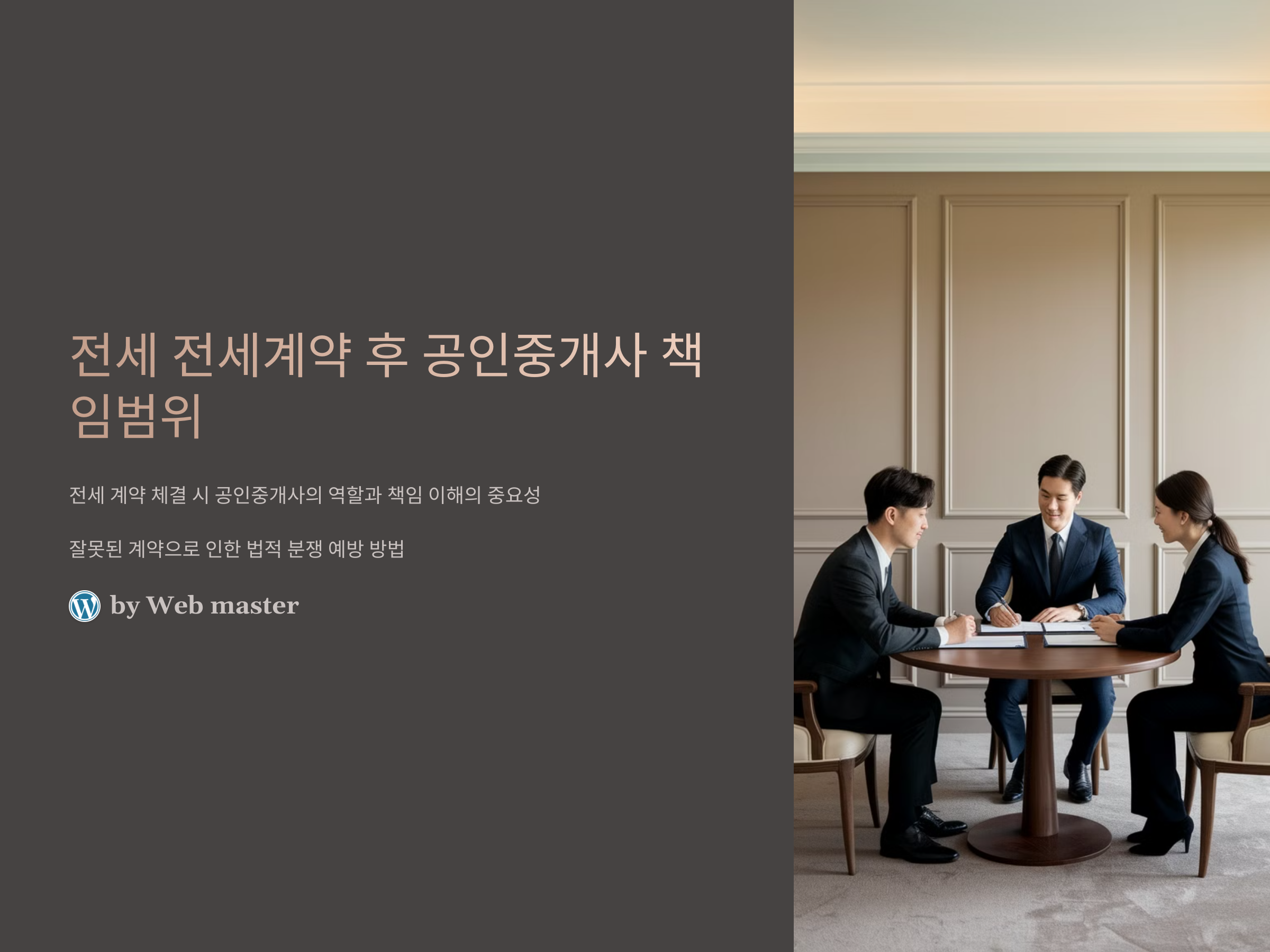 전세 계약을 체결할 때, 많은 사람들이 공인중개사의 역할과 책임에 대해 충분히 이해하지 못하는 경우가 많습니다. 하지만 전세 계약 후 공인중개사가 지는 법적 책임과 역할은 매우 중요합니다. 잘못된 계약으로 인한 법적 분쟁을 예방하려면, 공인중개사가 제공하는 서비스의 범위와 그들의 책임에 대해 미리 알아보는 것이 필요합니다. 만약 전세계약 후 문제가 생겼다면, 공인중개사는 어떤 법적 책임을 질 수 있을까요? 이를 이해하고 대응 방안을 마련하는 것이 중요합니다.