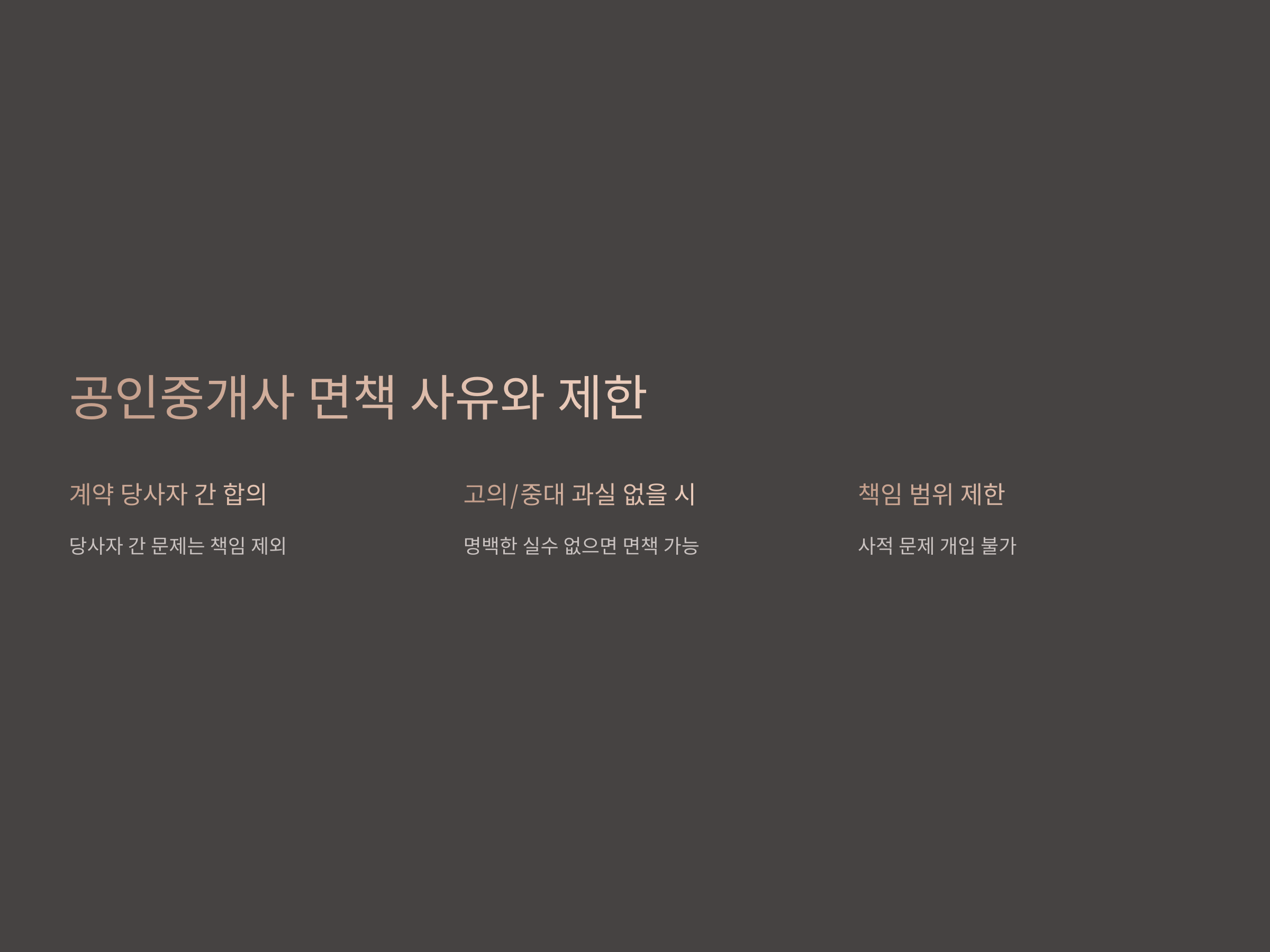- 고의 또는 중대한 과실이 없을 경우: 공인중개사가 고의적으로 계약서를 잘못 작성하거나, 정보를 숨기지 않았다면 그에 대해 법적 책임을 지지 않을 수 있습니다. 그러나 중대한 과실이 있는 경우에는 책임을 물을 수 있습니다.