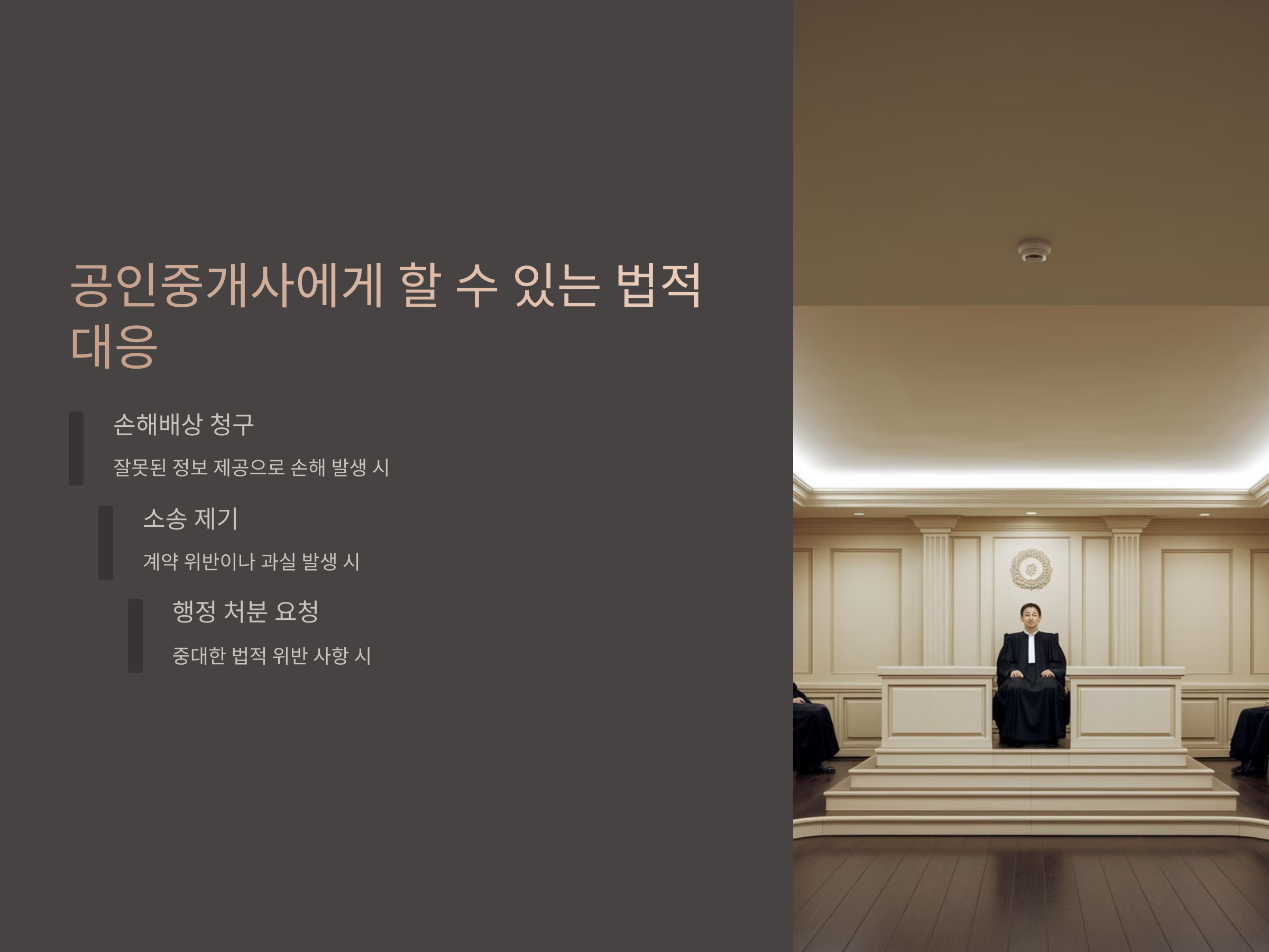 - 손해배상 청구: 계약이 체결된 후, 공인중개사의 잘못된 정보 제공으로 손해를 입었다면, 피해자는 공인중개사에게 손해배상 청구를 할 수 있습니다.