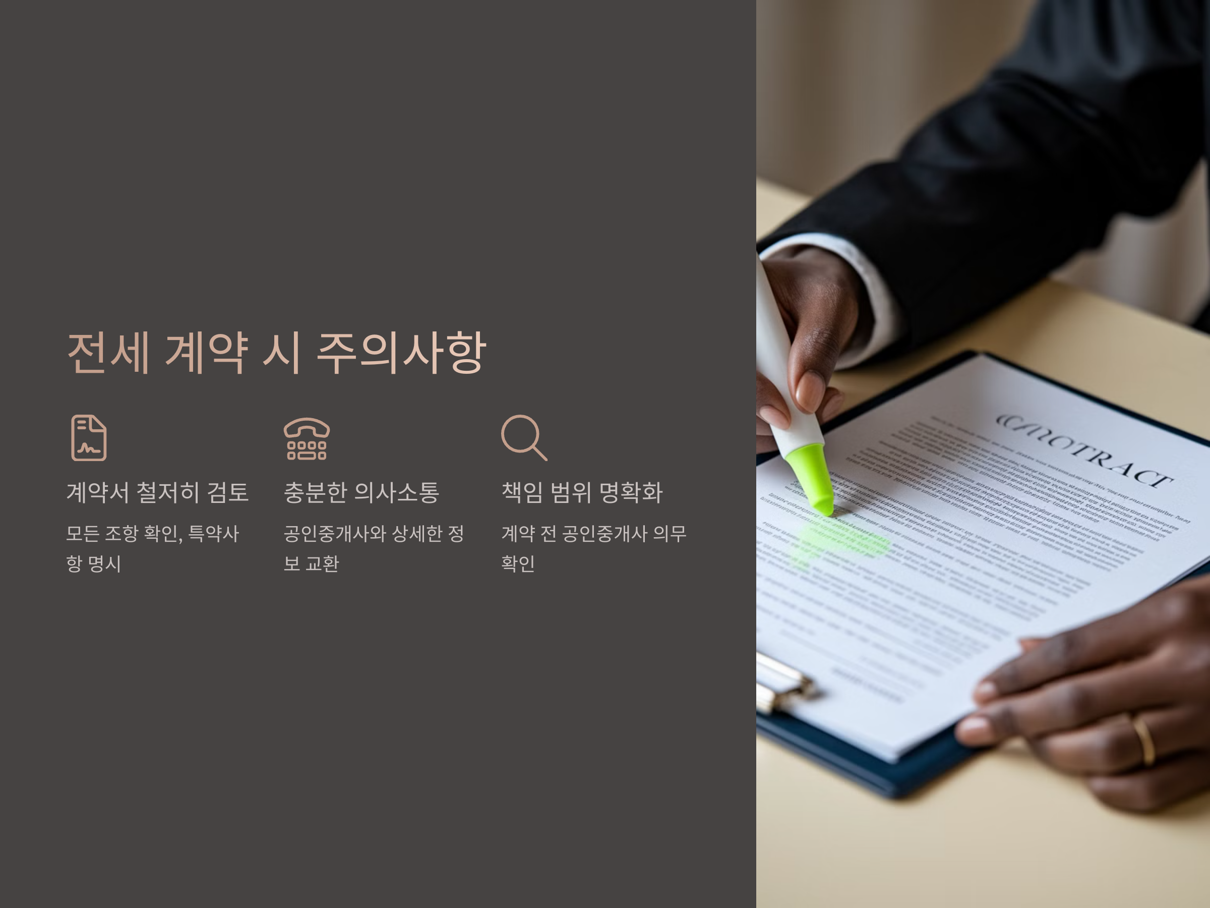 전세 계약 후 발생할 수 있는 문제를 예방하려면, 계약 전 공인중개사에게 책임 범위와 의무를 명확히 물어보고, 필요한 경우 법적 조치를 취할 준비가 되어 있어야 합니다. 불필요한 분쟁을 막기 위해서는 계약서 작성 시 충분한 검토가 필요하며, 공인중개사와의 의사소통을 철저히 해야 합니다.