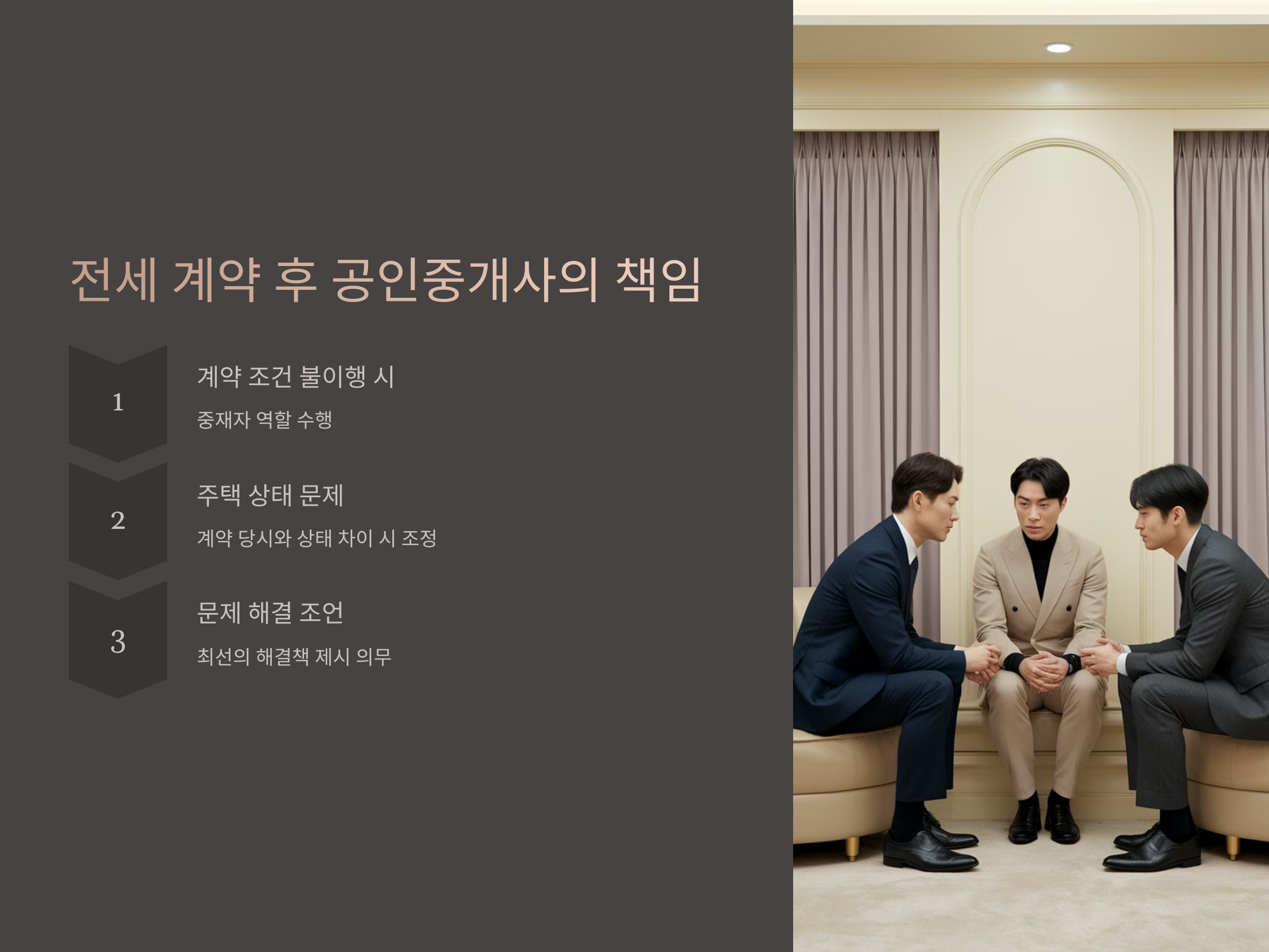 전세 계약 후에도 공인중개사의 책임은 계속해서 존재합니다. 예를 들어, 계약서에 명시된 조건이 실제로 지켜지지 않거나, 주택의 상태가 계약 당시와 달라지는 등의 문제가 발생할 경우, 공인중개사는 중재자 역할을 할 수 있습니다. 물론 계약 후 발생한 문제에 대해서 공인중개사가 직접적으로 책임을 지는 것은 아니지만, 상황에 따라 일부 책임을 질 수 있습니다.