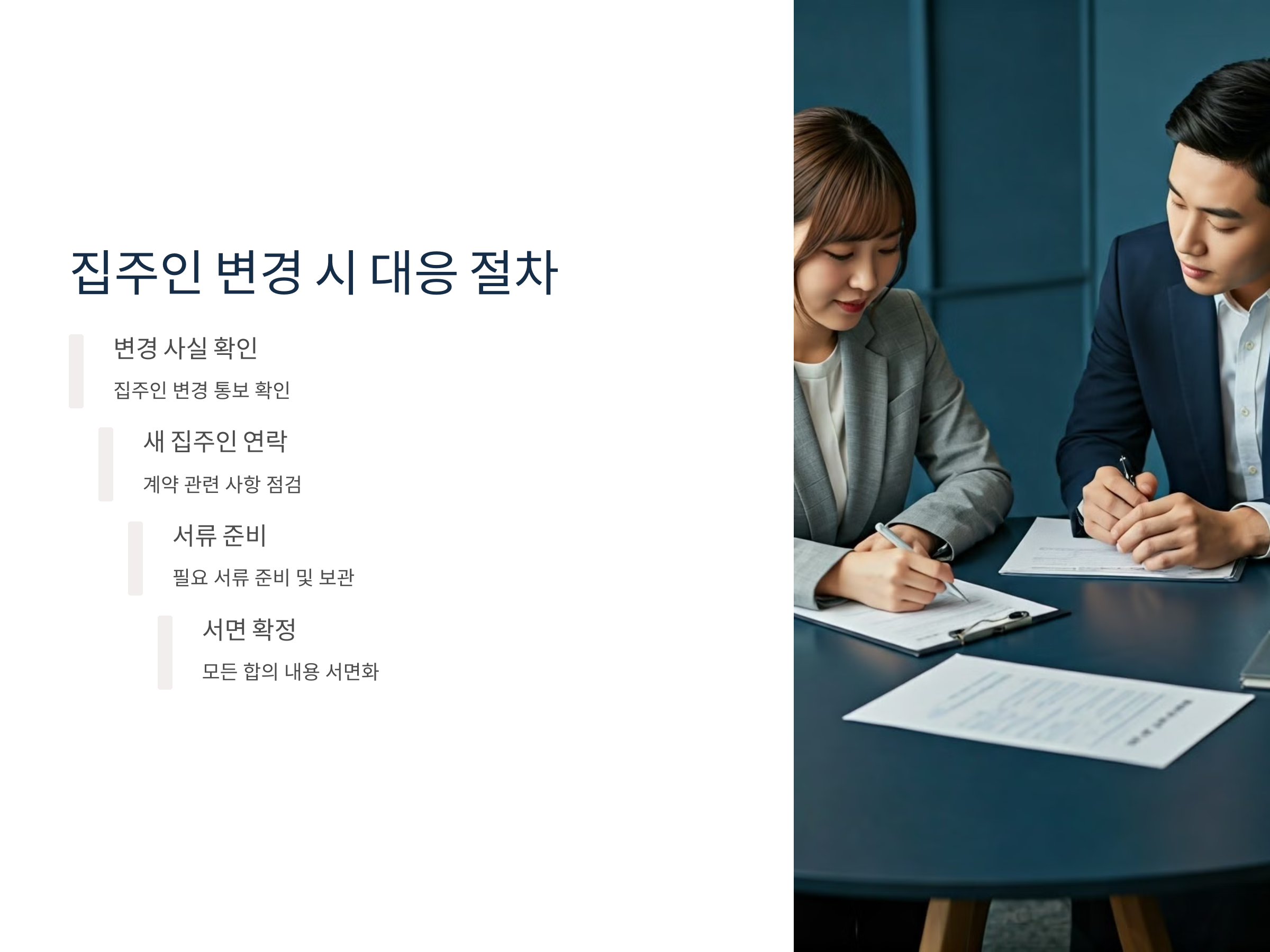 또한, 집주인 변경에 따른 임대료 인상이나 기타 조건 변경이 있을 수 있기 때문에 이를 계약서에 반영하여 향후 분쟁을 예방하는 것이 좋습니다. 새로운 집주인과의 계약 사항을 구체적으로 기록하고, 필요한 서류를 확보해 두는 것이 중요합니다.