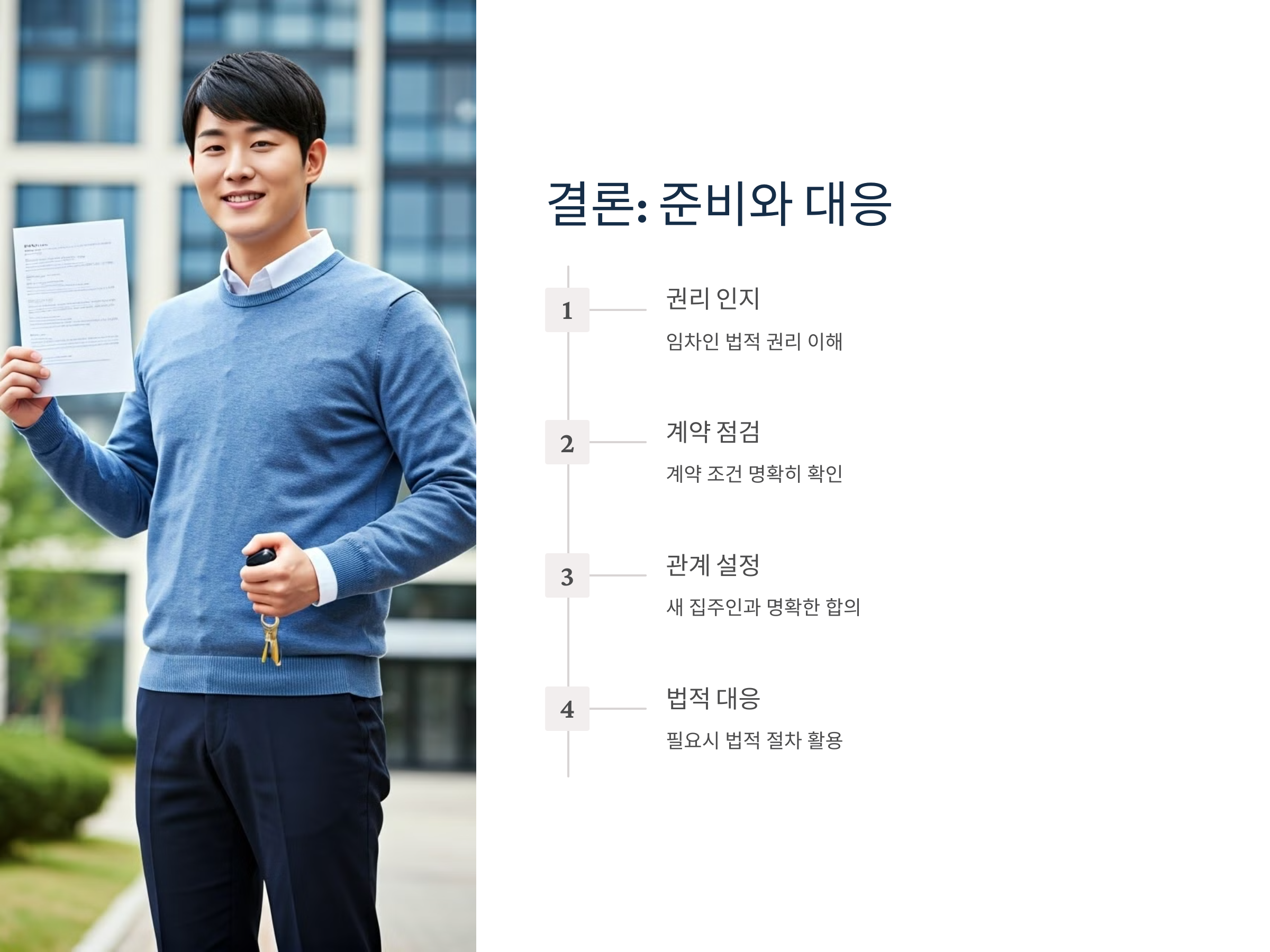 만약 집주인 변경 사실을 임차인이 알지 못한 채 살고 있었다면, 새로운 집주인에게 계약 내용에 대한 확인을 요청할 필요가 있습니다. 이를 통해 보증금 반환 시점이나 계약 기간 등을 다시 한 번 점검하고, 혹시 모를 법적 분쟁을 예방할 수 있습니다.