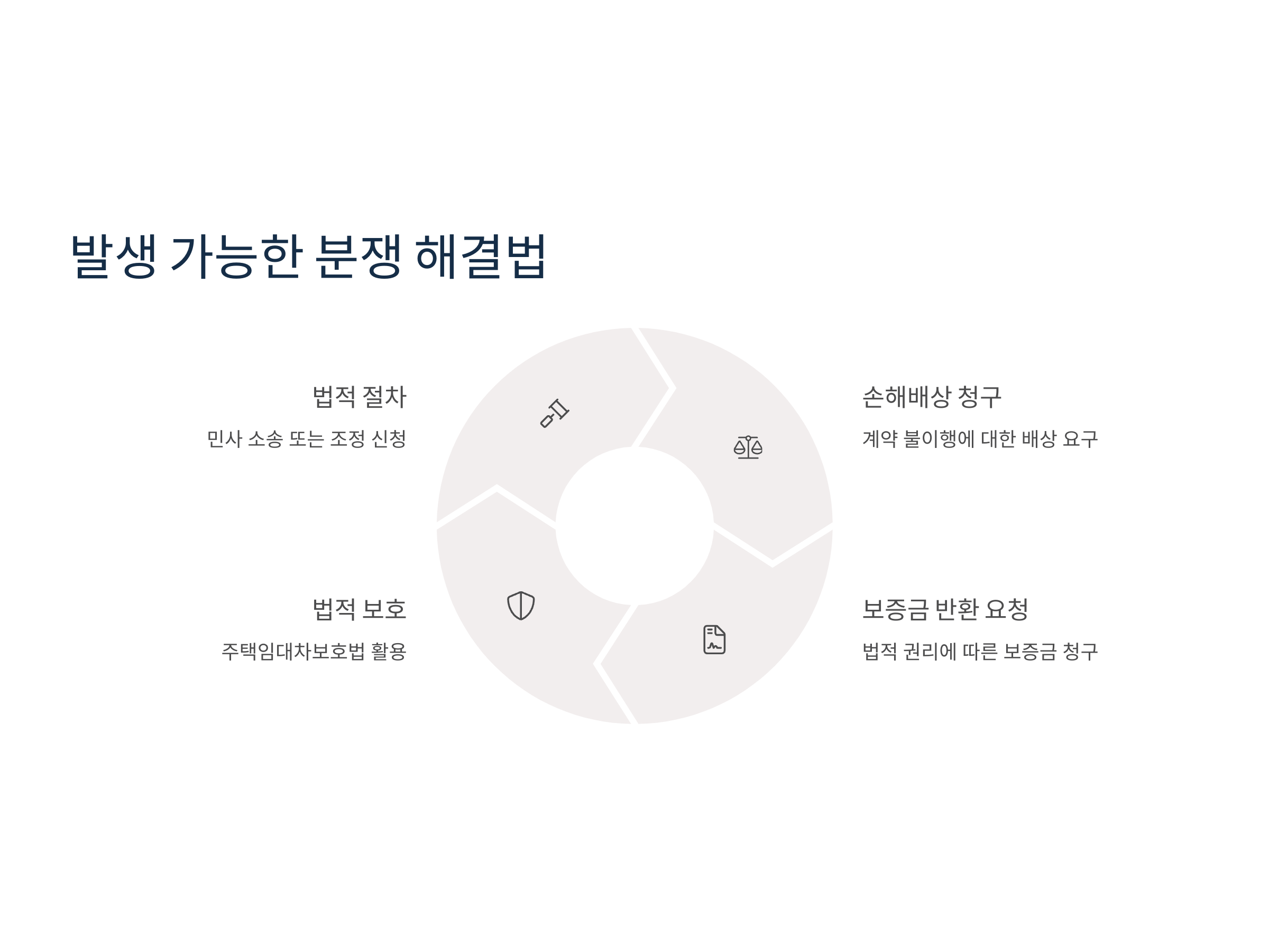 이때 필요한 법적 절차는 민사 소송 또는 조정 신청입니다. 민사 소송을 통해 계약 불이행에 대한 손해배상을 청구하거나, 보증금 반환을 요구할 수 있습니다. 또한, 한국의 주택임대차보호법을 활용하여 임차인의 권리를 보호할 수 있습니다.