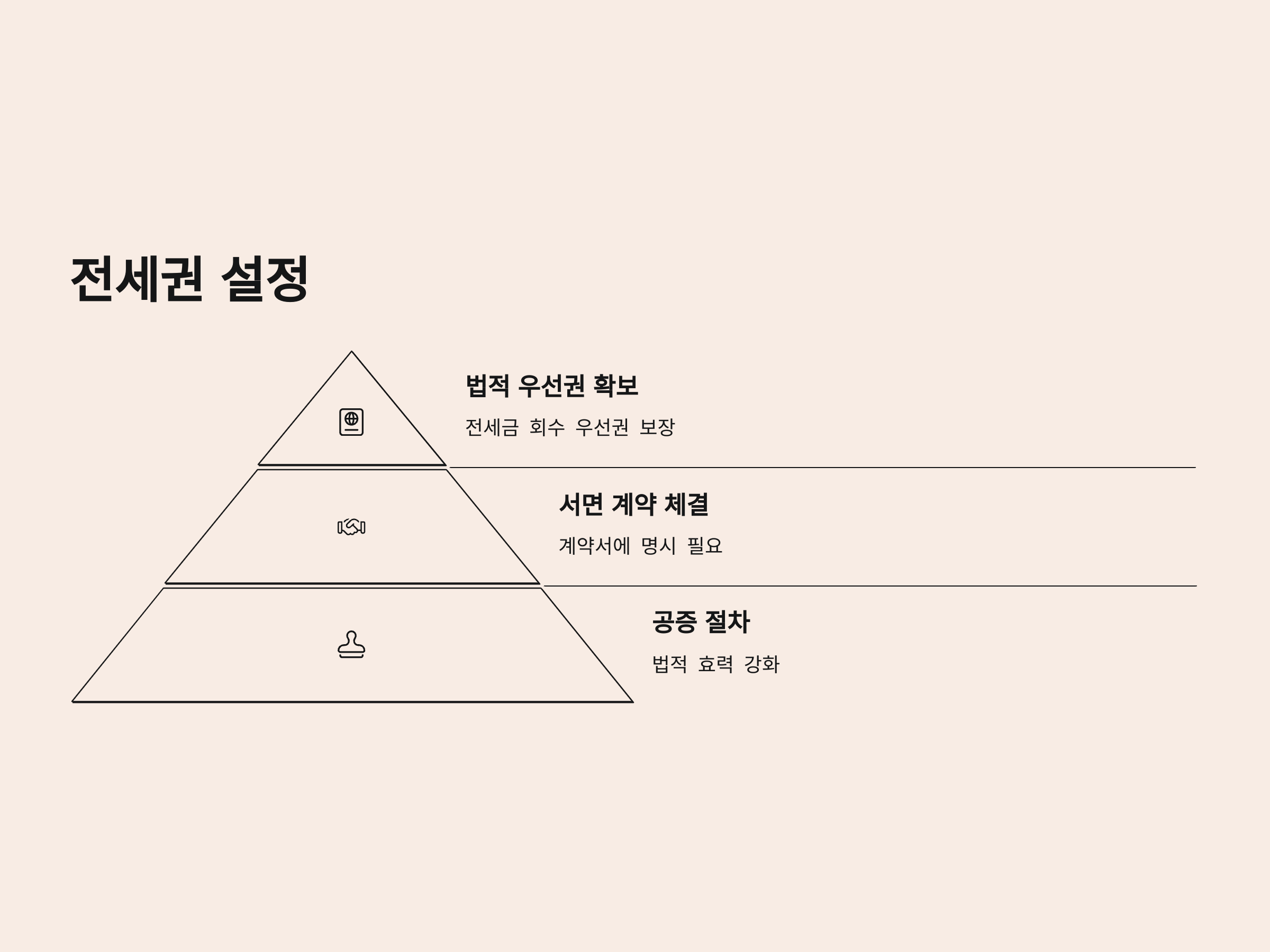 전세권 설정은 계약서에 명시하여 집주인과의 서면 계약을 통해 이루어지며, 이를 통해 세입자는 법적으로 전세금을 보호받을 수 있는 권리를 확보합니다. 이를 공증받으면, 법적으로 집주인이나 제3자의 권리보다 우선적으로 전세금을 회수할 수 있는 우선순위를 부여받게 됩니다.