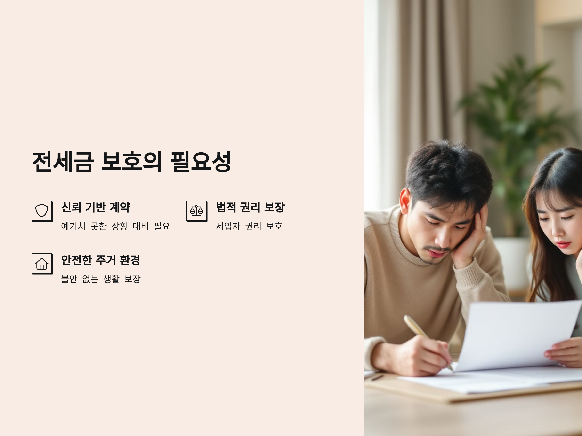 전세 계약은 세입자와 집주인 간의 신뢰를 바탕으로 이루어집니다. 하지만 이 신뢰가 항상 유지될 수 있는 것은 아닙니다. 예기치 못한 상황에서 집주인이 전세금을 반환하지 않거나 계약을 위반할 가능성도 존재합니다. 이러한 위험을 미리 방지하기 위해 법적으로 전세금을 보호하는 절차가 필요합니다. 이를 통해 세입자는 전세금 반환에 대한 권리를 보장받고, 법적으로 안전한 계약을 유지할 수 있습니다.