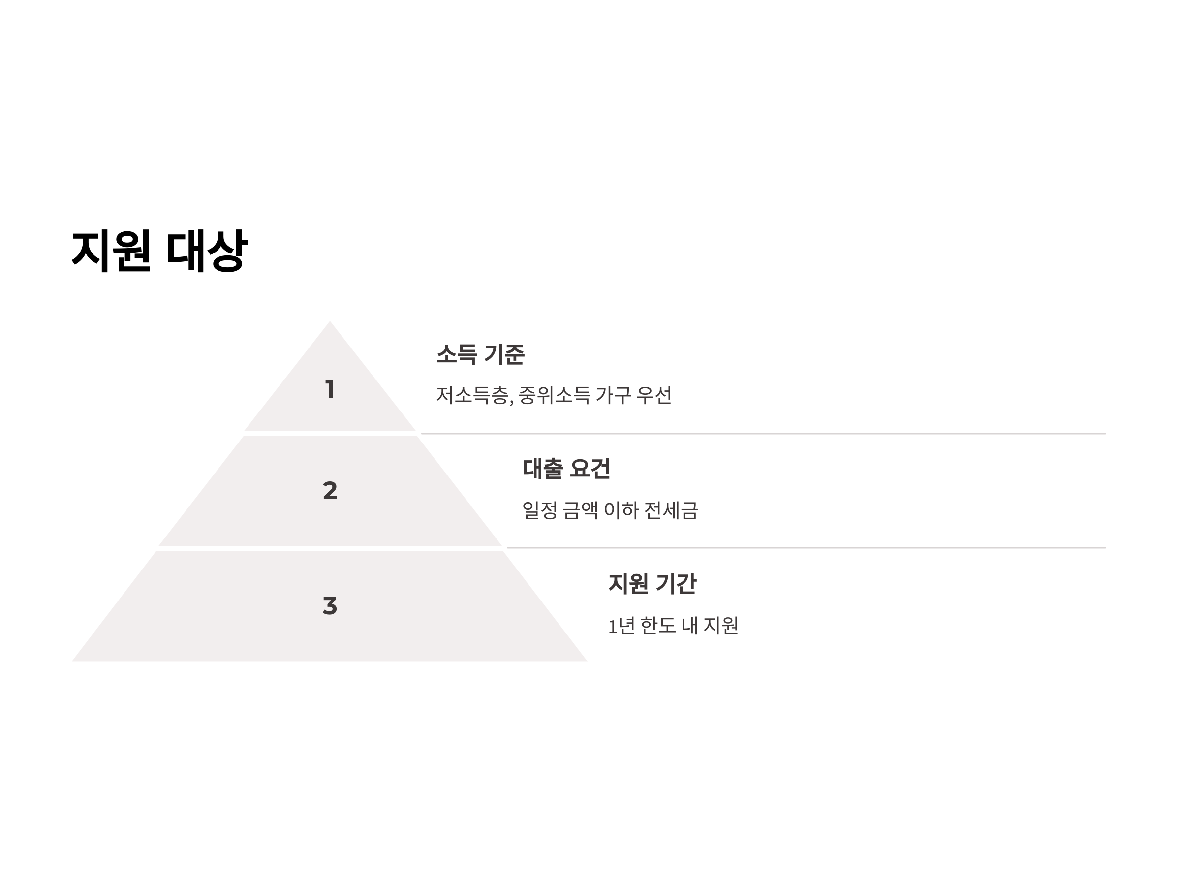 이 정책은 전세대출을 이용하려는 모든 사람에게 적용되는 것이 아닙니다. 정책의 대상자는 소득 기준과 대출 요건을 충족하는 사람들입니다. 예를 들어, 소득이 일정 수준 이하인 가구, 즉 저소득층이나 중위소득 가구들이 우선적으로 지원 대상에 포함됩니다. 또한, 대출을 받기 위한 조건으로 전세금이 일정 금액 이하일 때 지원이 가능합니다.