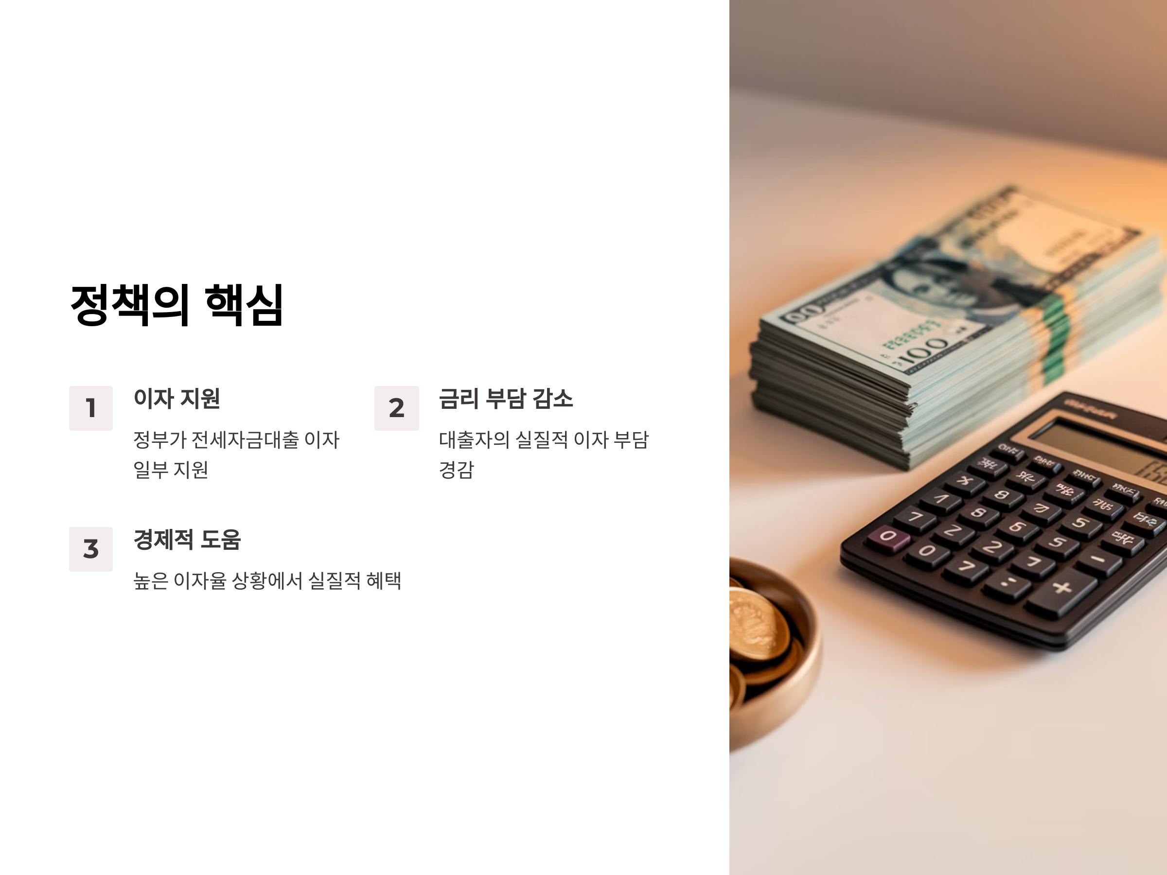 이 정책의 주요 목표는 전세금 대출을 이용하는 사람들의 부담을 줄이는 것입니다. 금리가 높아지는 상황에서 대출이자 부담이 커지기 때문에, 이자 지원을 통해 가계의 경제적 부담을 덜어줄 수 있습니다. 또한, 전세금 마련에 어려움을 겪고 있는 가구들에게는 주거비용 절감이라는 측면에서도 큰 도움이 됩니다.