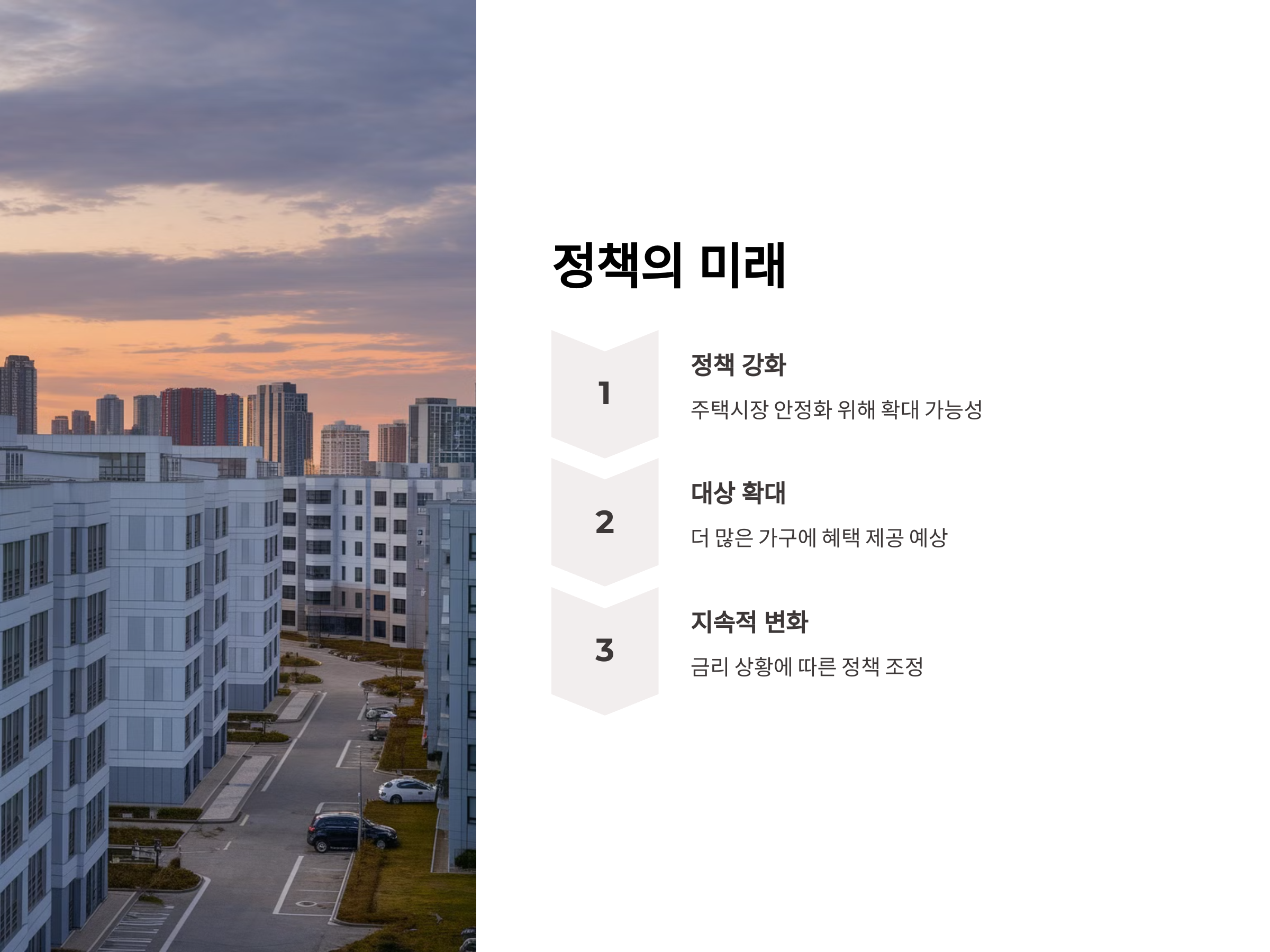 앞으로 전세대출이자지원정책은 더욱 강화될 가능성이 높습니다. 정부는 주택시장의 불안정성을 해소하고, 주거 안정성을 높이기 위해 점차 정책을 확대할 수 있습니다. 특히, 금리 인상이 계속될 경우, 정부의 지원이 필요한 가구는 더욱 많아질 것으로 예상됩니다.