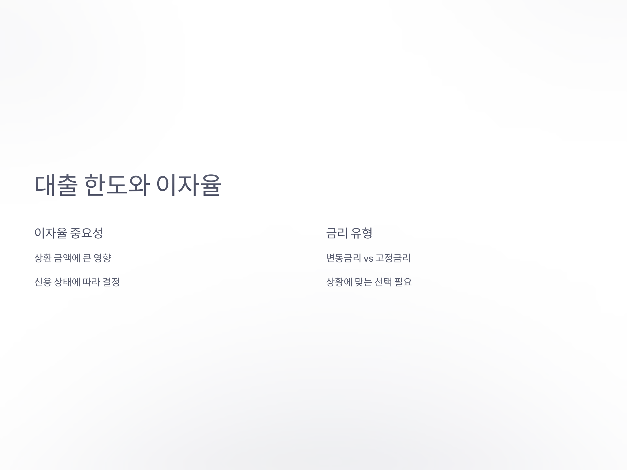 대출 한도가 높아질수록 상환해야 할 금액도 커지기 때문에, 이자율을 잘 비교하고 본인의 상환 능력에 맞는 대출 상품을 선택하는 것이 중요합니다. 또한, 변동금리와 고정금리의 차이점도 이해하고, 자신에게 적합한 대출 방식을 선택해야 합니다.