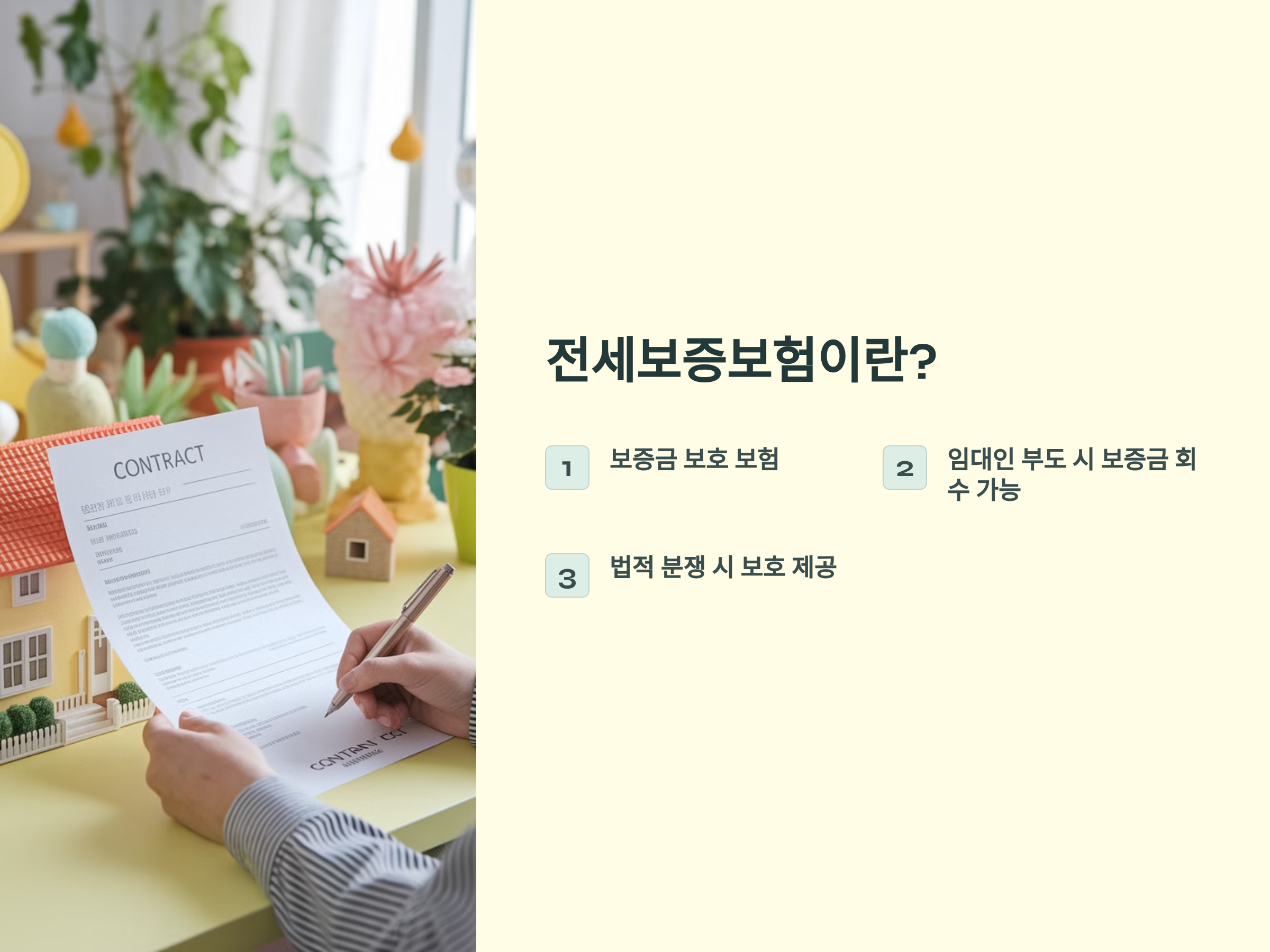 이 보험을 가입하면, 세입자는 전세금 반환을 보장받을 수 있기 때문에 임대인의 부도가 나거나 주택이 경매에 들어가더라도 보증금을 안전하게 회수할 수 있습니다. 또한, 전세보증보험에 가입된 세입자는 임대인과의 분쟁이 생겼을 때 법적 보호를 받는 장점이 있습니다.