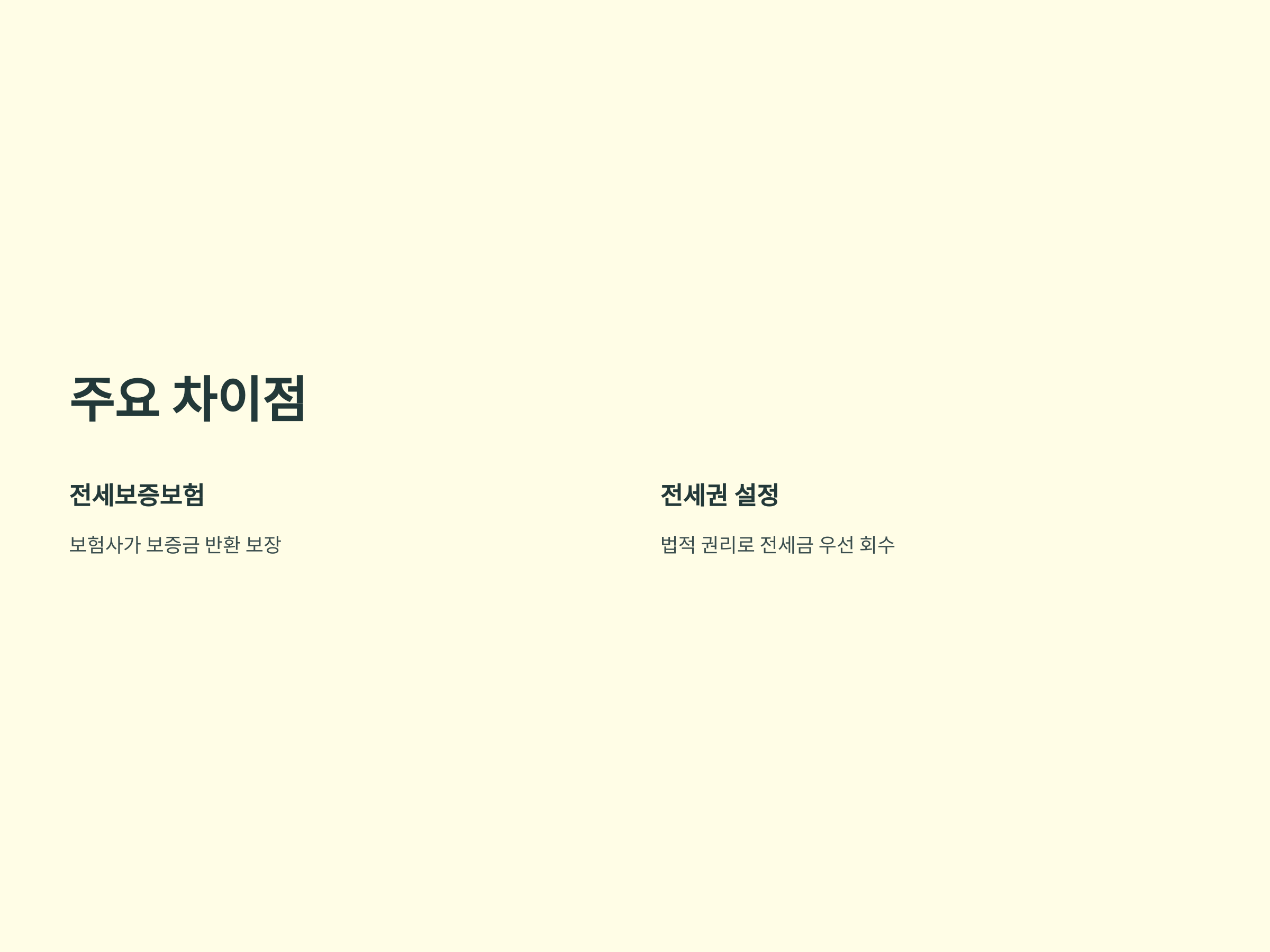 전세보증보험과 전세권 설정의 가장 큰 차이는 "보장 대상"과 "법적 효력"입니다.