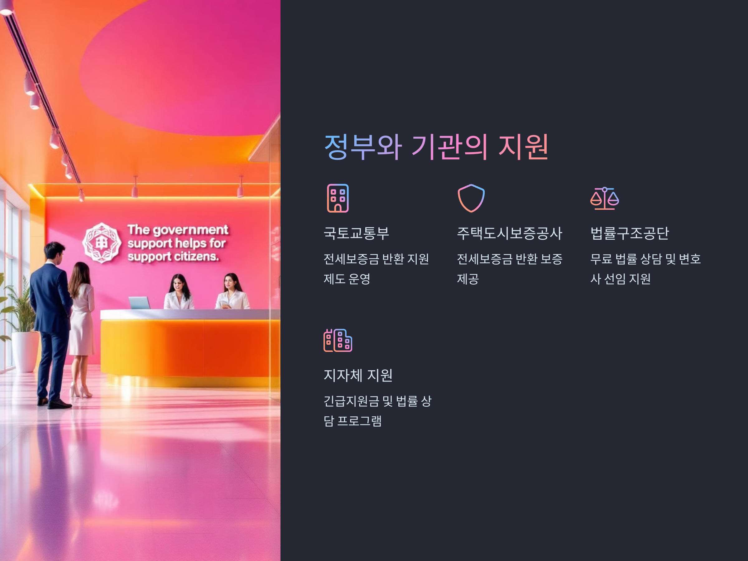 전세사기 피해자들은 다양한 정부 및 기관의 지원을 받을 수 있습니다. 정부는 피해자들이 신속하게 피해를 구제받을 수 있도록 법적 지원과 재정적 지원을 제공하고 있습니다. 주요 기관과 지원 방식은 다음과 같습니다: