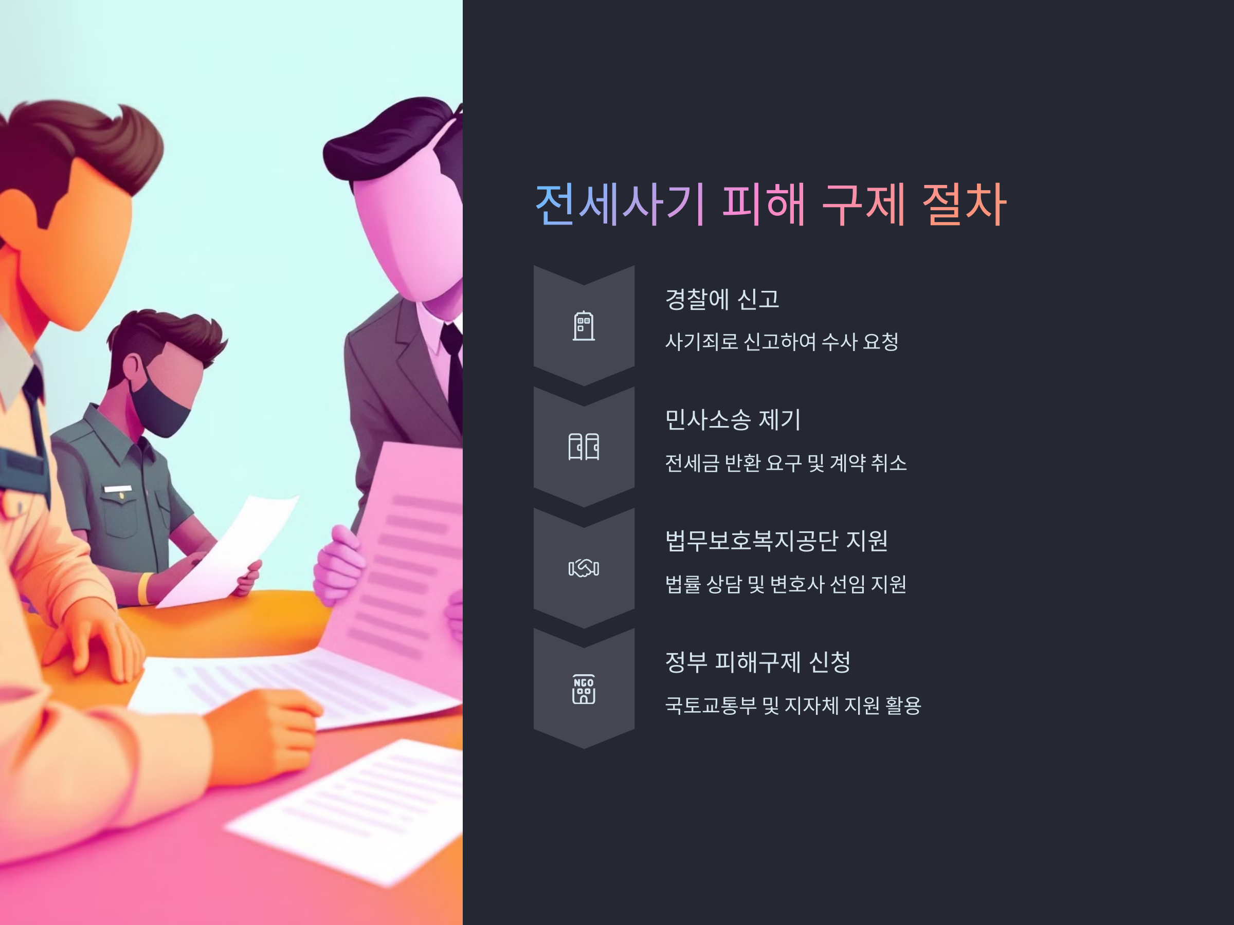 전세사기를 당한 경우, 피해를 최소화하고 구제받기 위해서는 빠르고 정확한 대응이 필요합니다. 피해를 당했을 때 취할 수 있는 절차는 다음과 같습니다: