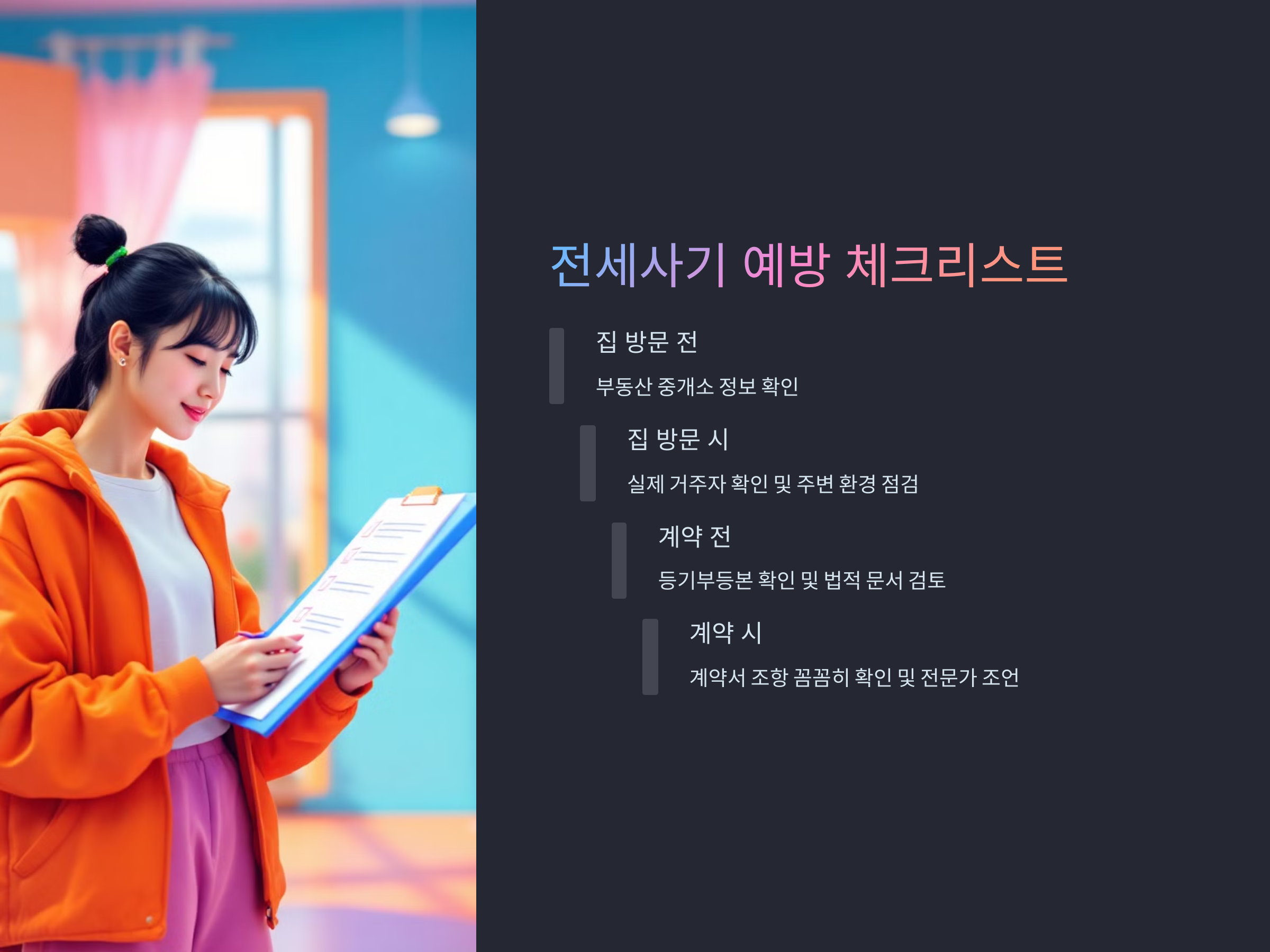 전세사기를 예방하려면, 전세 계약을 체결할 때 몇 가지 기본적인 수칙을 지켜야 합니다. 이를 통해 사기 피해를 예방하고, 안전하게 전세 계약을 맺을 수 있습니다: