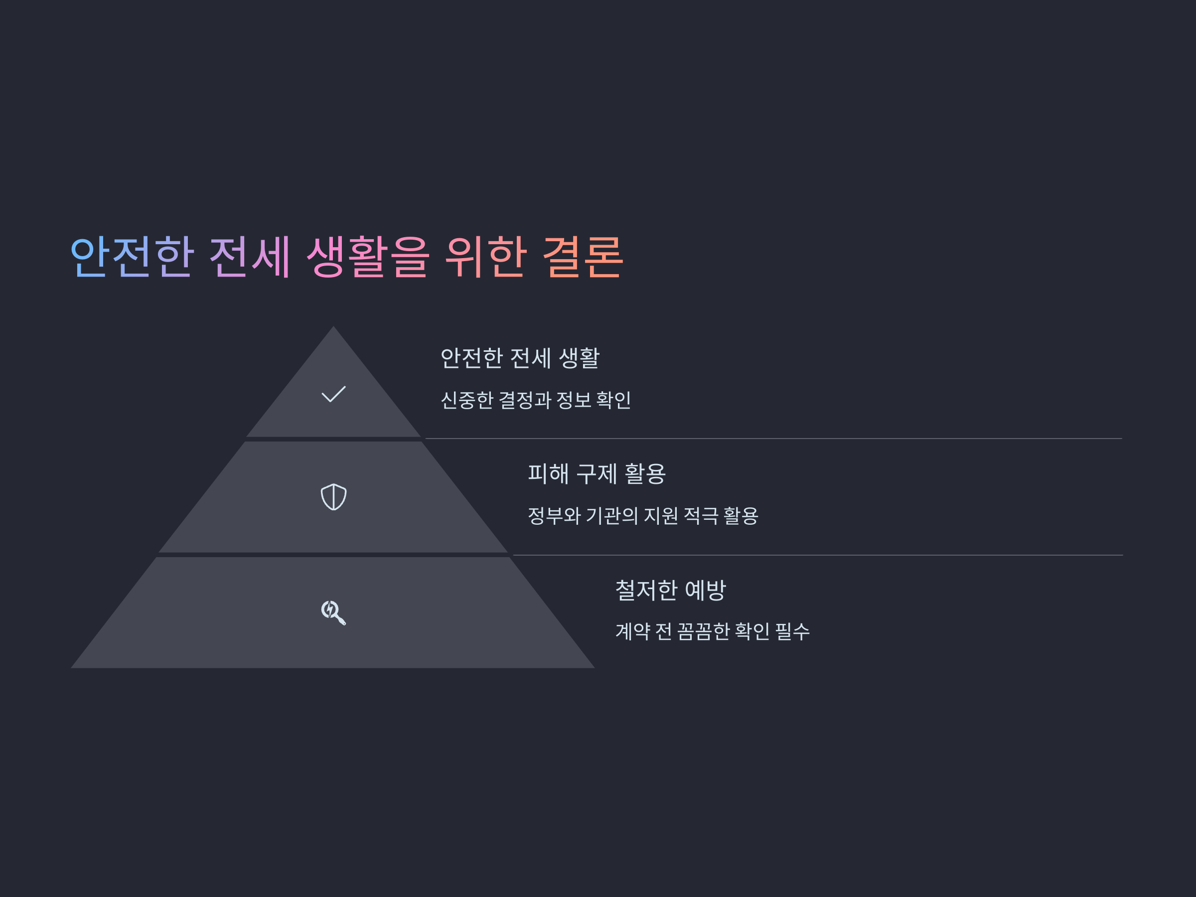 전세사기 피해는 누구에게나 일어날 수 있는 일입니다. 그러나 이를 예방하고 피해를 최소화하기 위한 방법은 분명히 존재합니다. 전세 계약을 체결할 때는 꼼꼼히 확인하고, 의심스러운 상황에서는 전문가의 도움을 받는 것이 중요합니다. 만약 피해를 입게 된다면, 빠르게 경찰 신고 및 법적 절차를 진행하여 피해를 회복할 수 있습니다. 또한, 정부와 기관의 다양한 지원을 통해 법적, 재정적 구제를 받을 수 있으므로 이를 적극 활용해야 합니다.