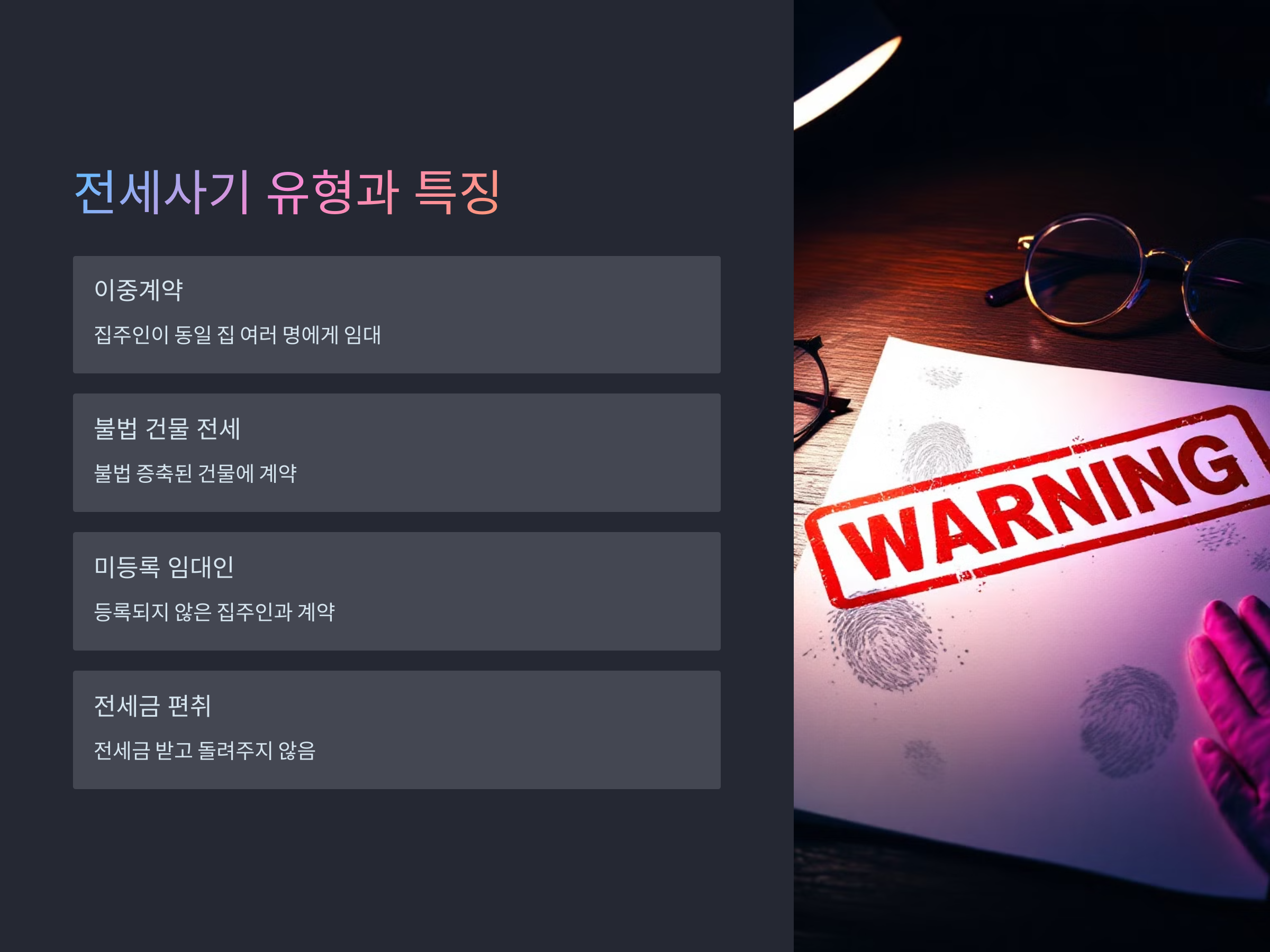 전세사기는 다양한 형태로 발생하며, 그 중 일부는 사기를 당한 후에야 알게 되는 경우가 많습니다. 대표적인 전세사기의 유형은 다음과 같습니다: