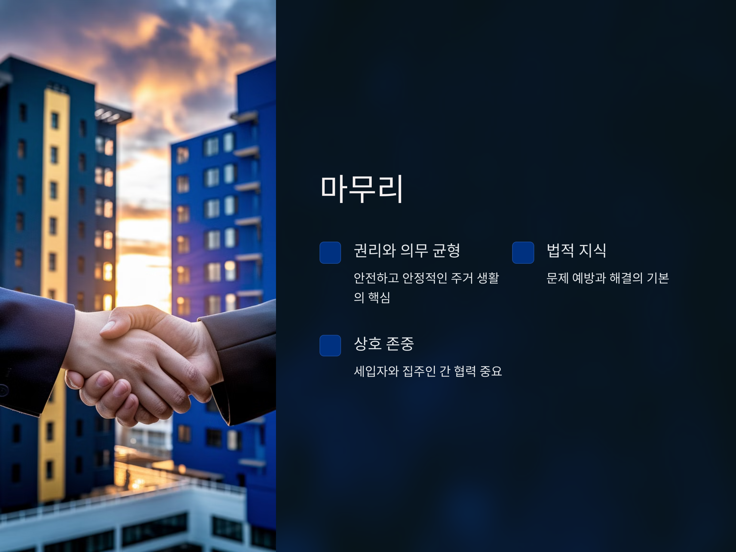 전세 계약은 많은 권리와 의무가 얽혀 있는 중요한 계약입니다. 세입자는 자신의 권리를 정확히 이해하고, 의무를 성실히 이행하는 것이 중요합니다. 이를 통해 전세 계약에서 발생할 수 있는 문제를 예방하고, 안전하고 안정적인 주거 생활을 이어갈 수 있습니다. 세입자와 집주인 간의 원활한 협력이 이루어지길 바랍니다.
