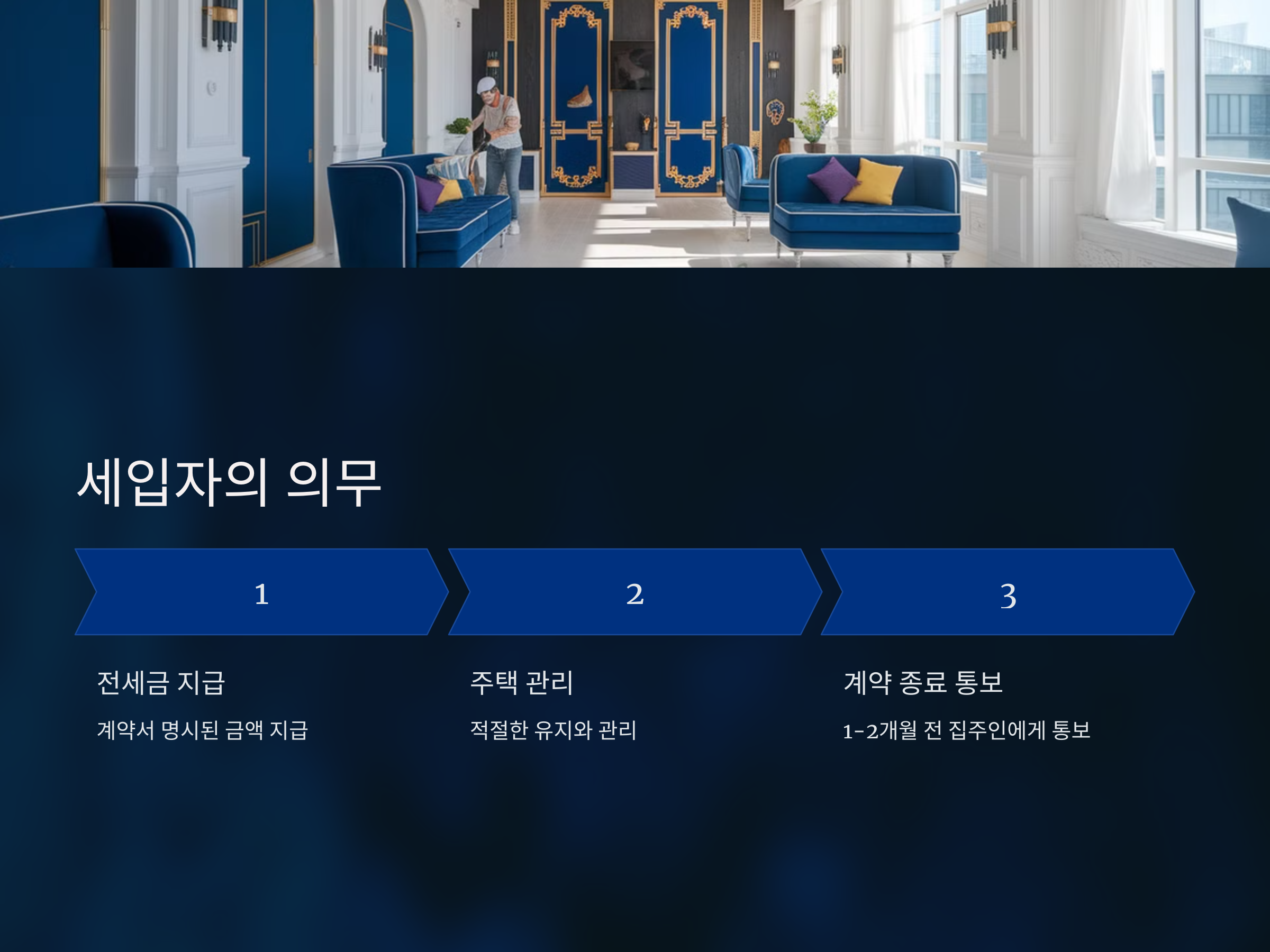 세입자에게는 전세 계약 기간 동안 지켜야 할 의무가 있습니다. 이 의무들은 세입자의 권리를 보호하기 위한 조건들이기도 하며, 계약의 정상적인 이행을 위한 중요한 사항들입니다.