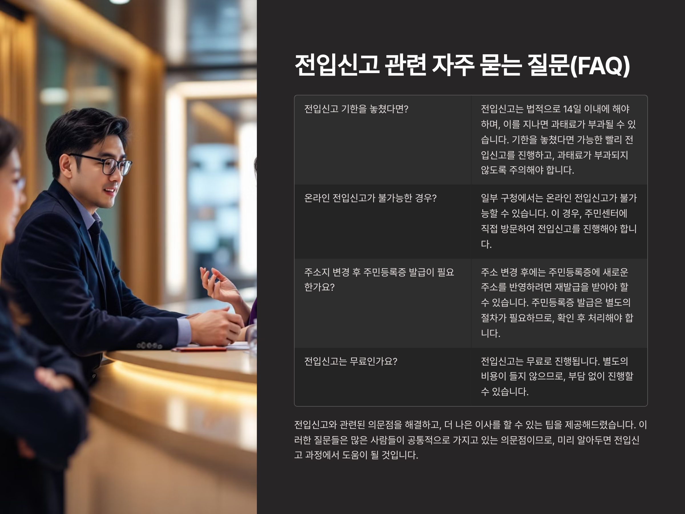 전입신고를 진행하면서 자주 묻는 질문들에 대해 알아보겠습니다. 이를 통해 전입신고와 관련된 의문점을 해결하고, 더 나은 이사를 할 수 있는 팁을 제공할 수 있습니다.