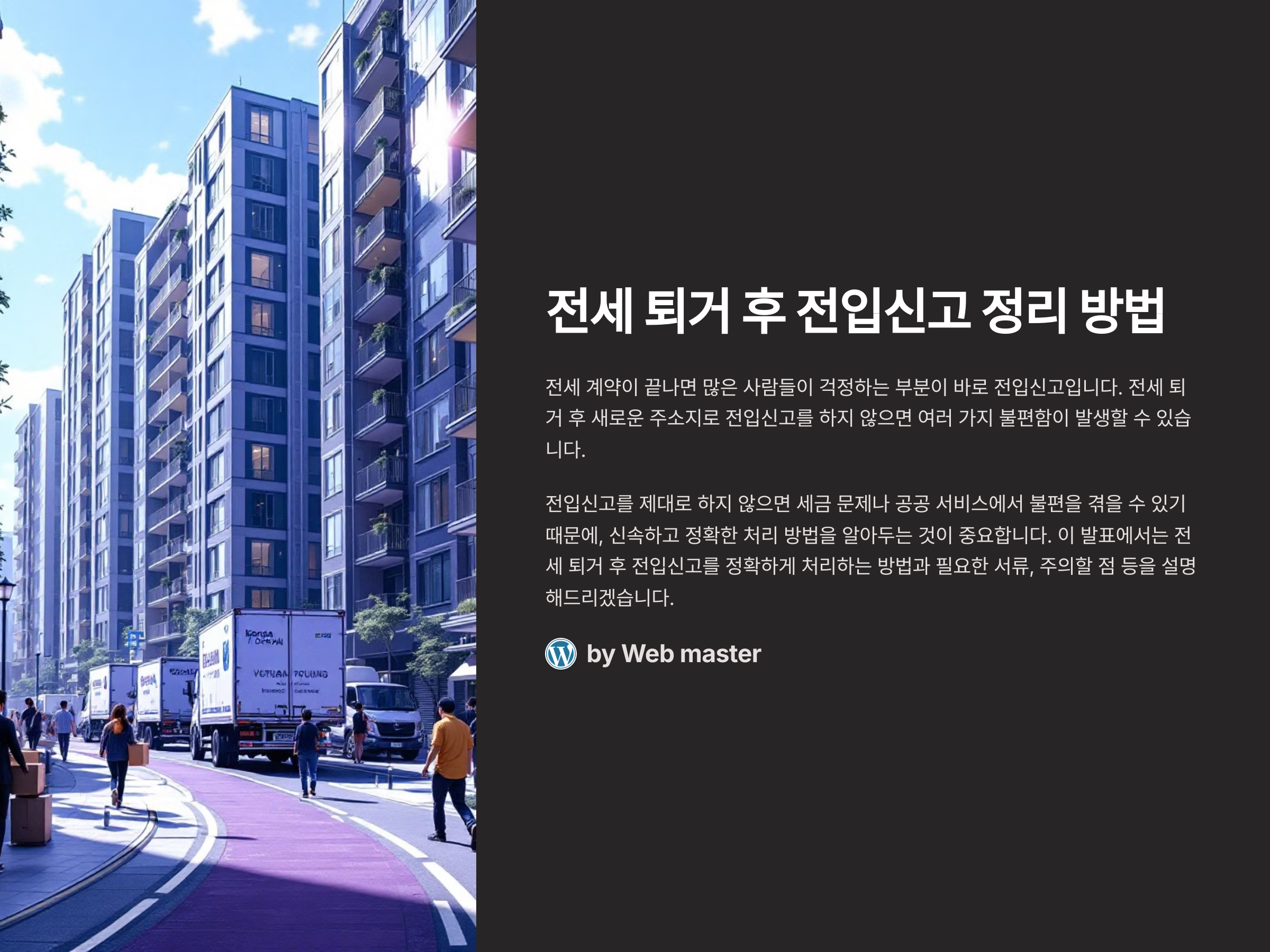 전세 퇴거 후 전입신고를 빠르게 처리할 수 있는 방법에 대해 다루면서, 주거지 이전에 필요한 모든 절차를 놓치지 않도록 정리해드리겠습니다. 여러분이 새로운 집으로 이사하고 나서, 어떤 점들을 유의해야 하는지 쉽게 이해할 수 있도록 정리해 보았습니다. 자, 그럼 전입신고 절차와 함께 신경 써야 할 부분들을 자세히 알아볼까요?