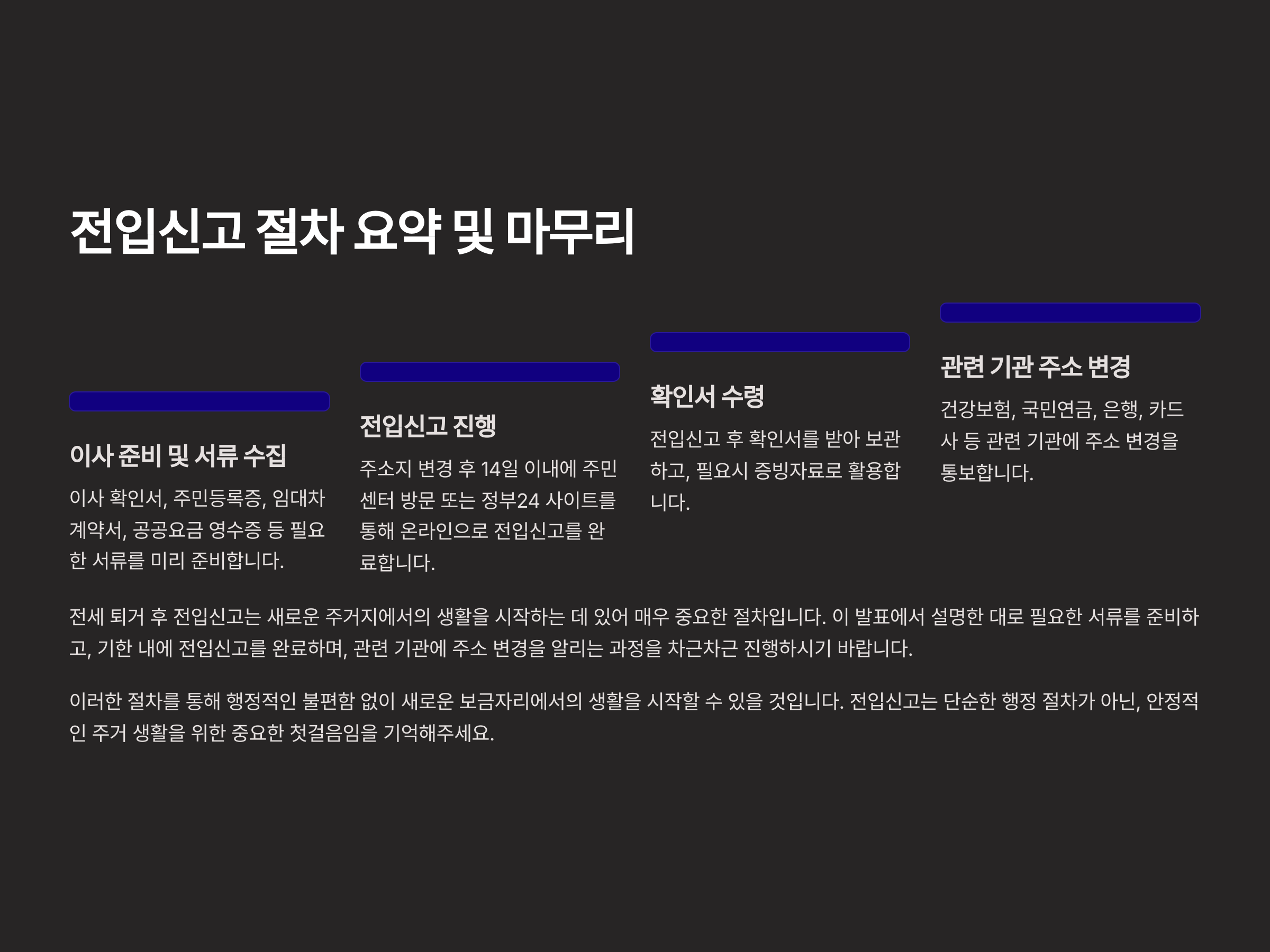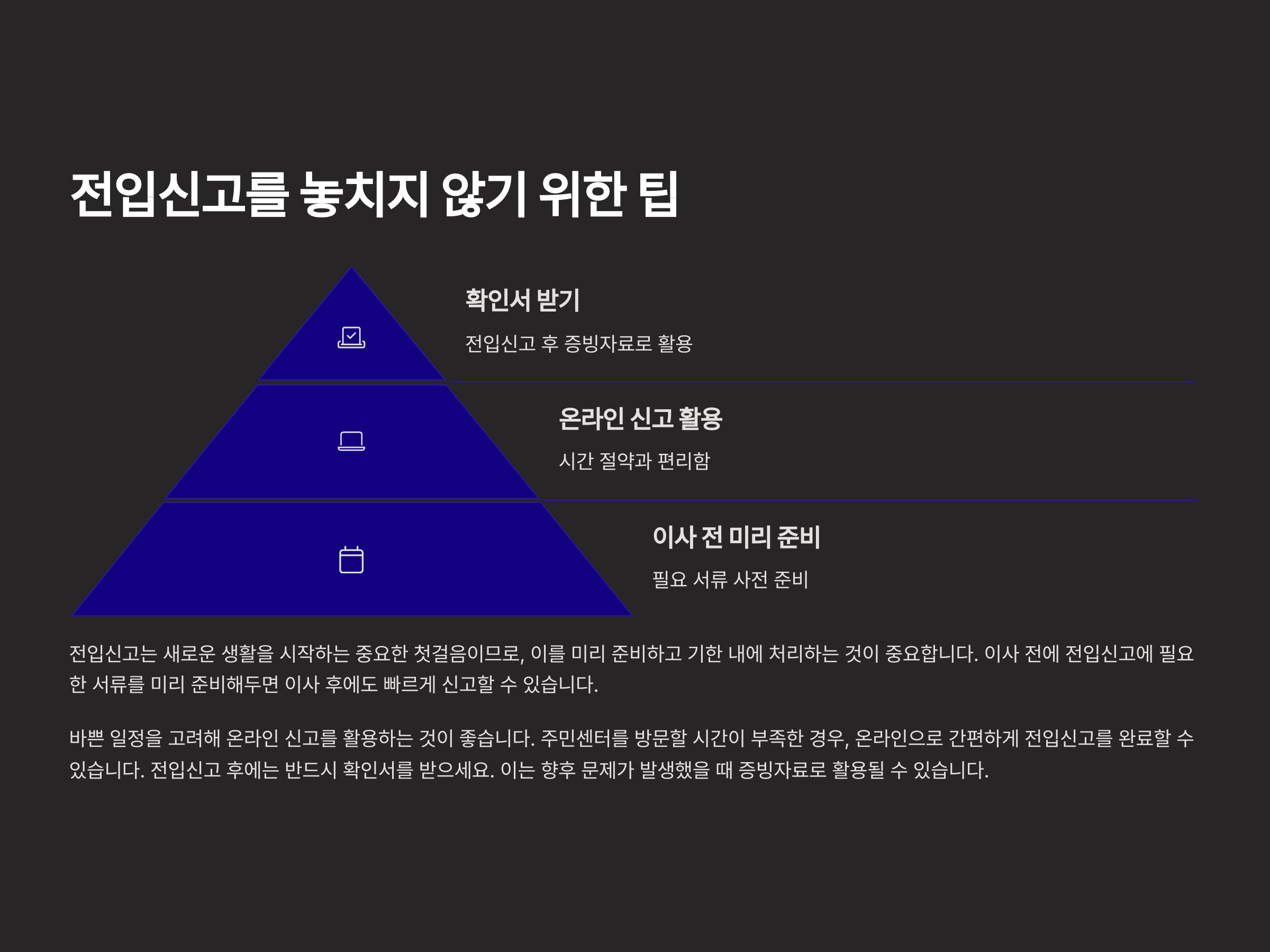 전입신고는 새로운 생활을 시작하는 중요한 첫걸음이므로, 이를 미리 준비하고 기한 내에 처리하는 것이 중요합니다. 이렇게 하면 이사 후 발생할 수 있는 행정적인 문제를 예방할 수 있습니다.