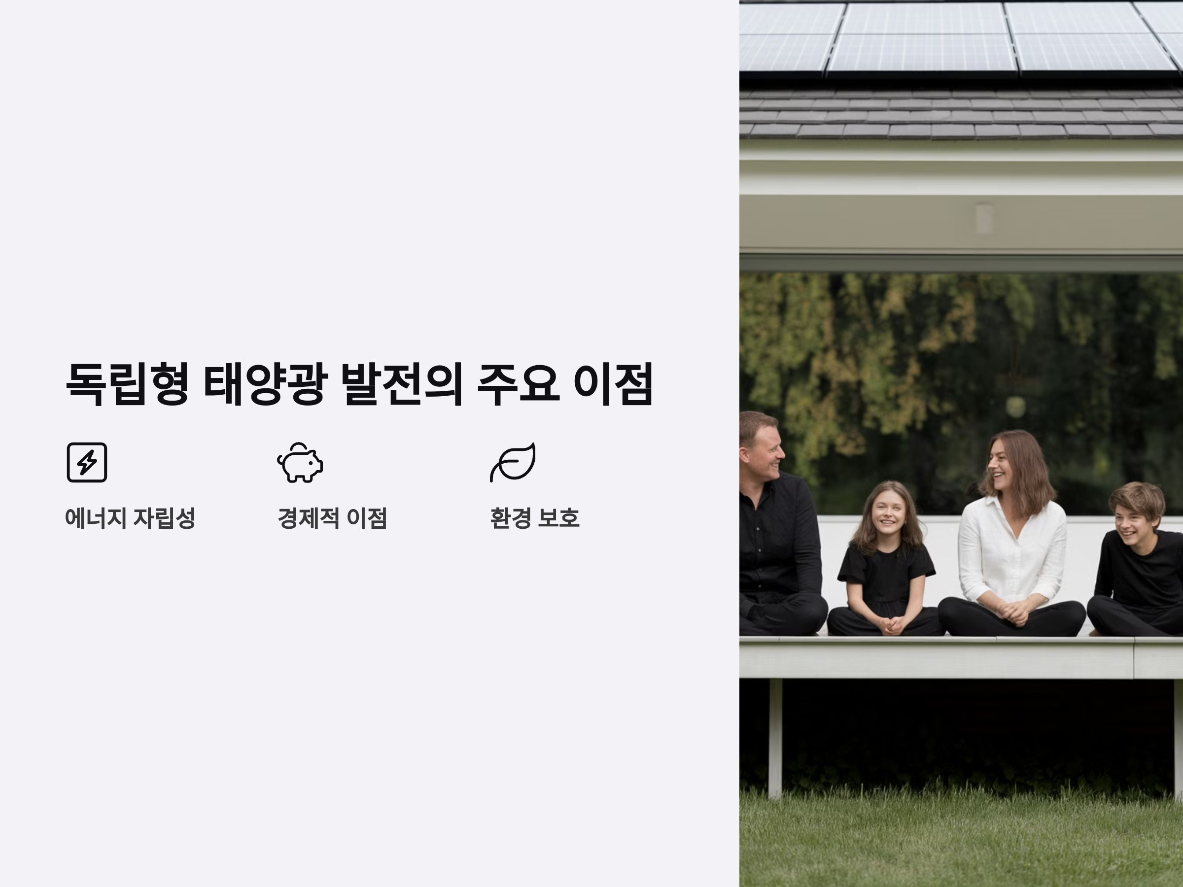 전원주택에서 독립형 태양광 발전 시스템은 많은 장점을 제공합니다. 에너지 자립성과 경제적 이점을 동시에 얻을 수 있으며, 환경 보호에도 기여할 수 있는 방법입니다. 이제 전원주택을 계획하거나 운영 중이라면, 독립형 태양광 발전 시스템을 꼭 고려해보세요.