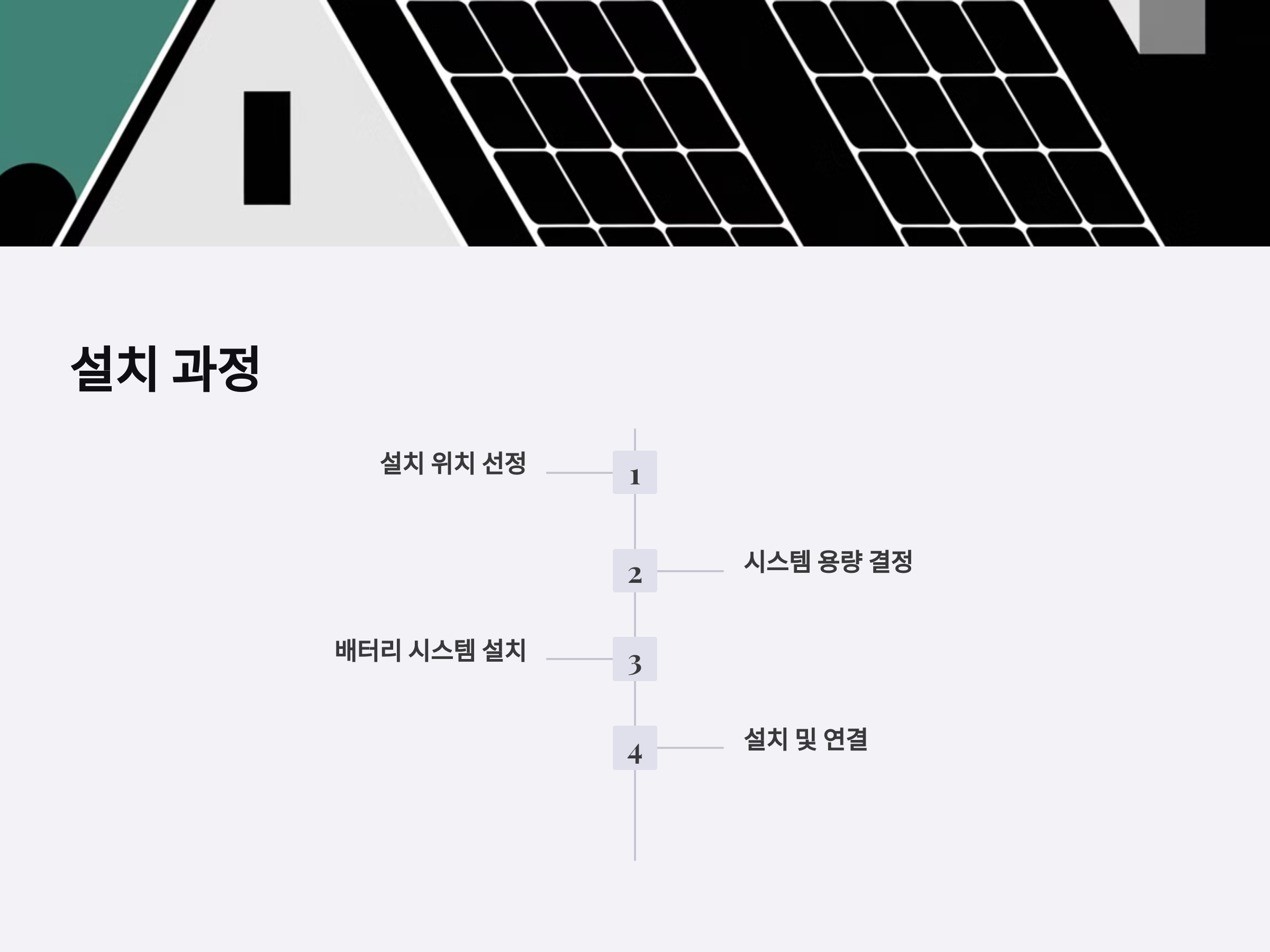 설치 전문가를 통해 태양광 패널, 인버터, 배터리 등의 장비를 설치합니다. 인버터는 직류(DC) 전기를 교류(AC) 전기로 변환하는 역할을 하며, 이를 통해 가정 내의 대부분의 전자 기기들이 전기를 사용할 수 있습니다. 모든 장비가 설치되면, 전력 시스템을 연결하여 작동 테스트를 진행합니다.