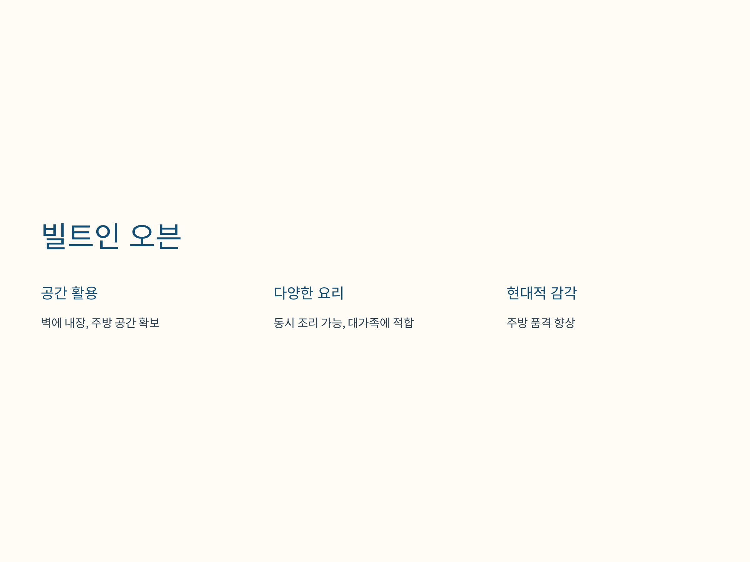 다음으로 추천드리는 빌트인 가전은 오븐입니다. 전원주택에서는 주방에서 많은 시간을 보내게 되는데, 빌트인 오븐은 조리의 효율성을 높여주는 중요한 역할을 합니다. 오븐은 빌트인 형태로 설치되면, 주방의 공간을 더 넓게 활용할 수 있게 도와줍니다.
