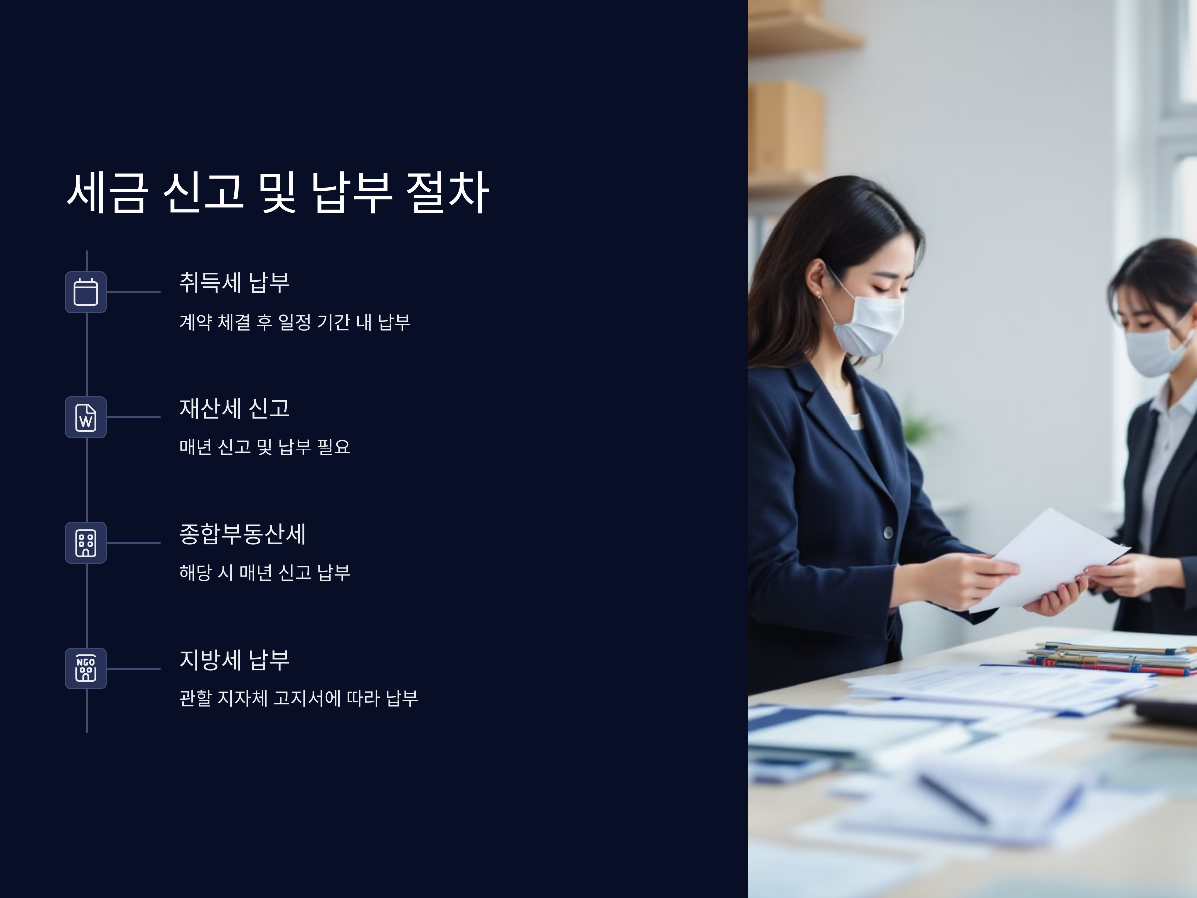 세금 신고 및 납부 절차를 정확히 알지 못하면 불이익을 받을 수 있으므로, 구입한 전원주택에 대한 세금 신고와 납부 일정을 반드시 확인하는 것이 중요합니다. 이를 위해 세무서나 관할 지자체의 세금 관련 부서에서 정보를 얻고, 세금 납부 기한을 놓치지 않도록 주의해야 합니다.