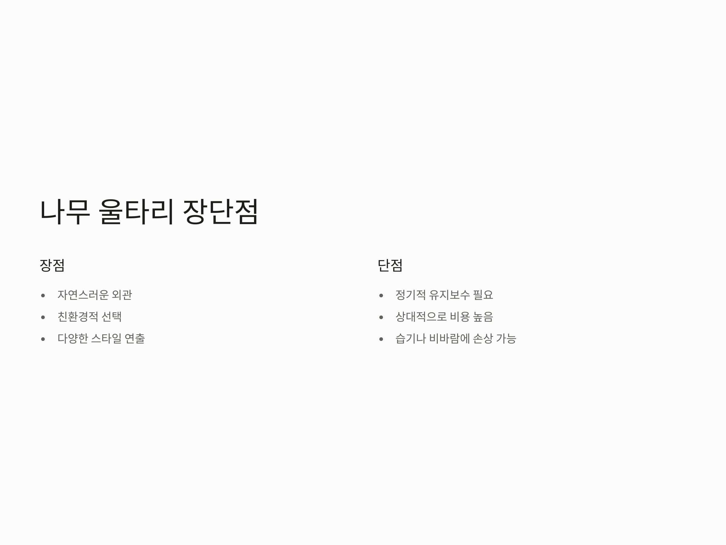 - 비용: 나무 울타리는 다른 재료보다 상대적으로 비쌀 수 있습니다. 특히 좋은 품질의 나무를 선택할 경우 비용이 증가할 수 있습니다.