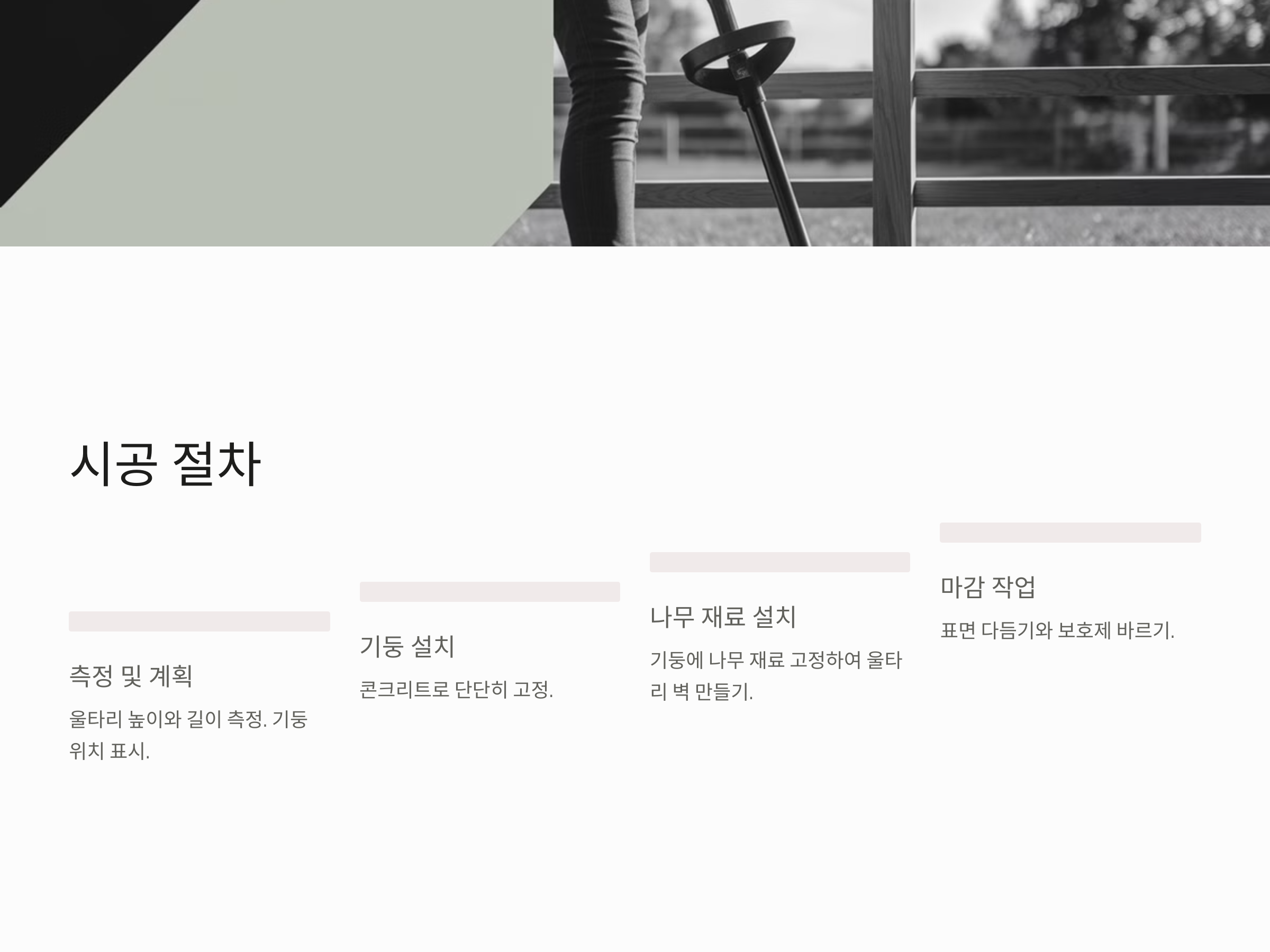 - 나무 재료 설치: 기둥이 고정되면, 나무 재료를 기둥에 고정시켜 울타리의 벽을 만들어갑니다.